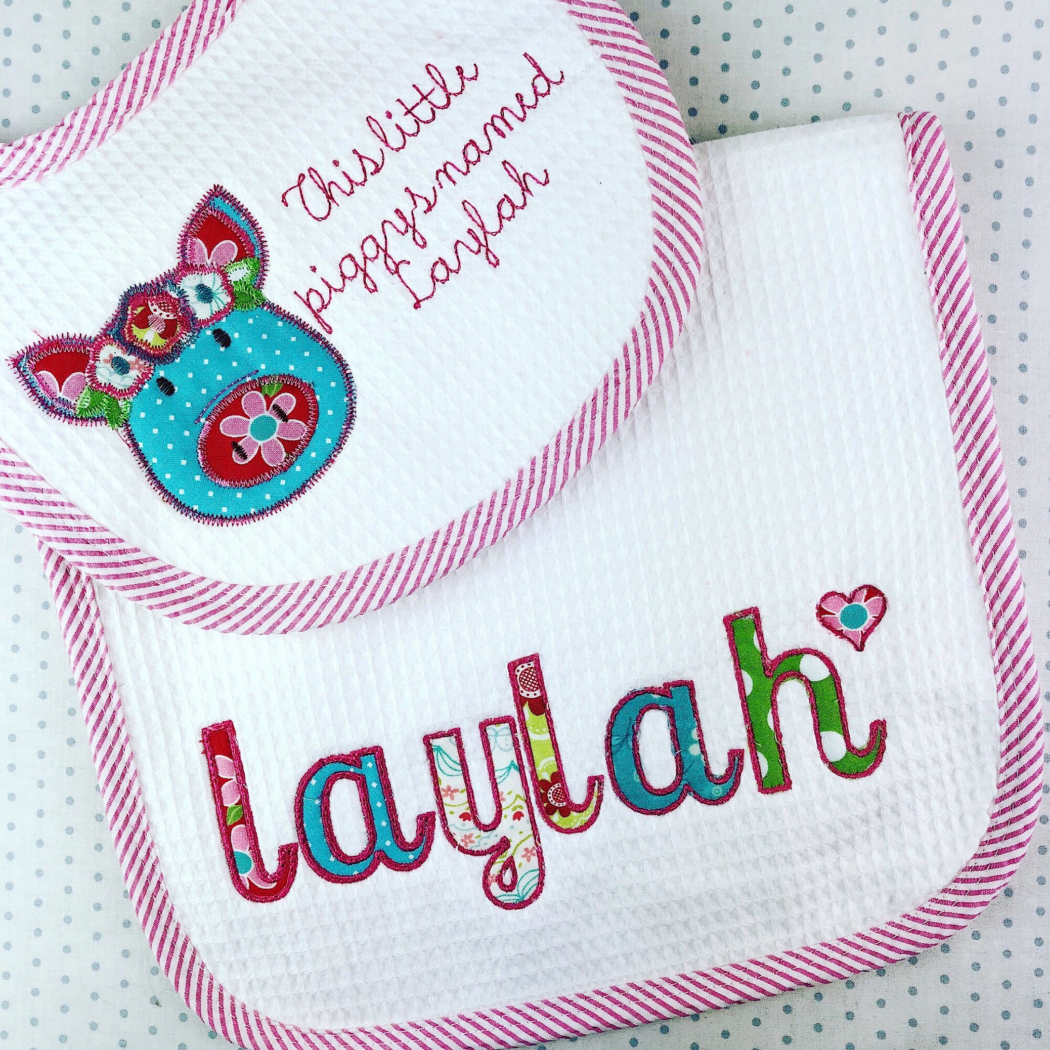 A sweet little duo or precious all by themselves.  A little sugar can never have too many bibs or burp cloths!