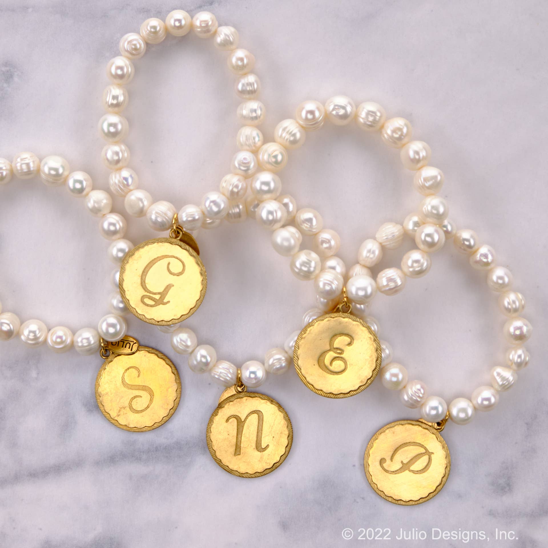 Add timeless elegance to your jewelry box with the Japan Engraved Initial Charm on Pearl Bracelet. This classic stretch bracelet features genuine freshwater pearls, perfectly sized at 7” to fit most wrists. The highlight is an engraved uppercase initial medallion—making it both personal and meaningful.