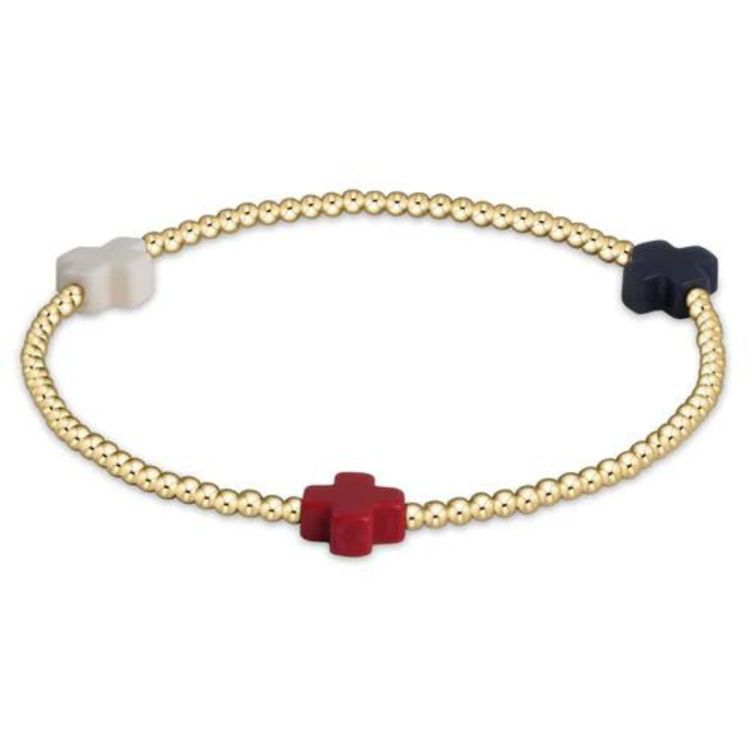 - Material: Crafted with 2mm, 14kt gold-filled beads and signature crosses in vibrant red, off-white, and navy