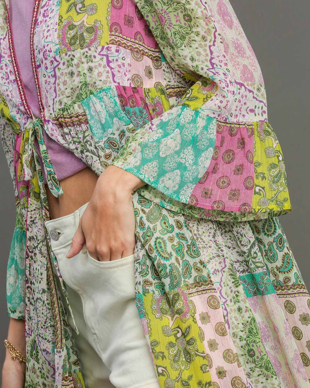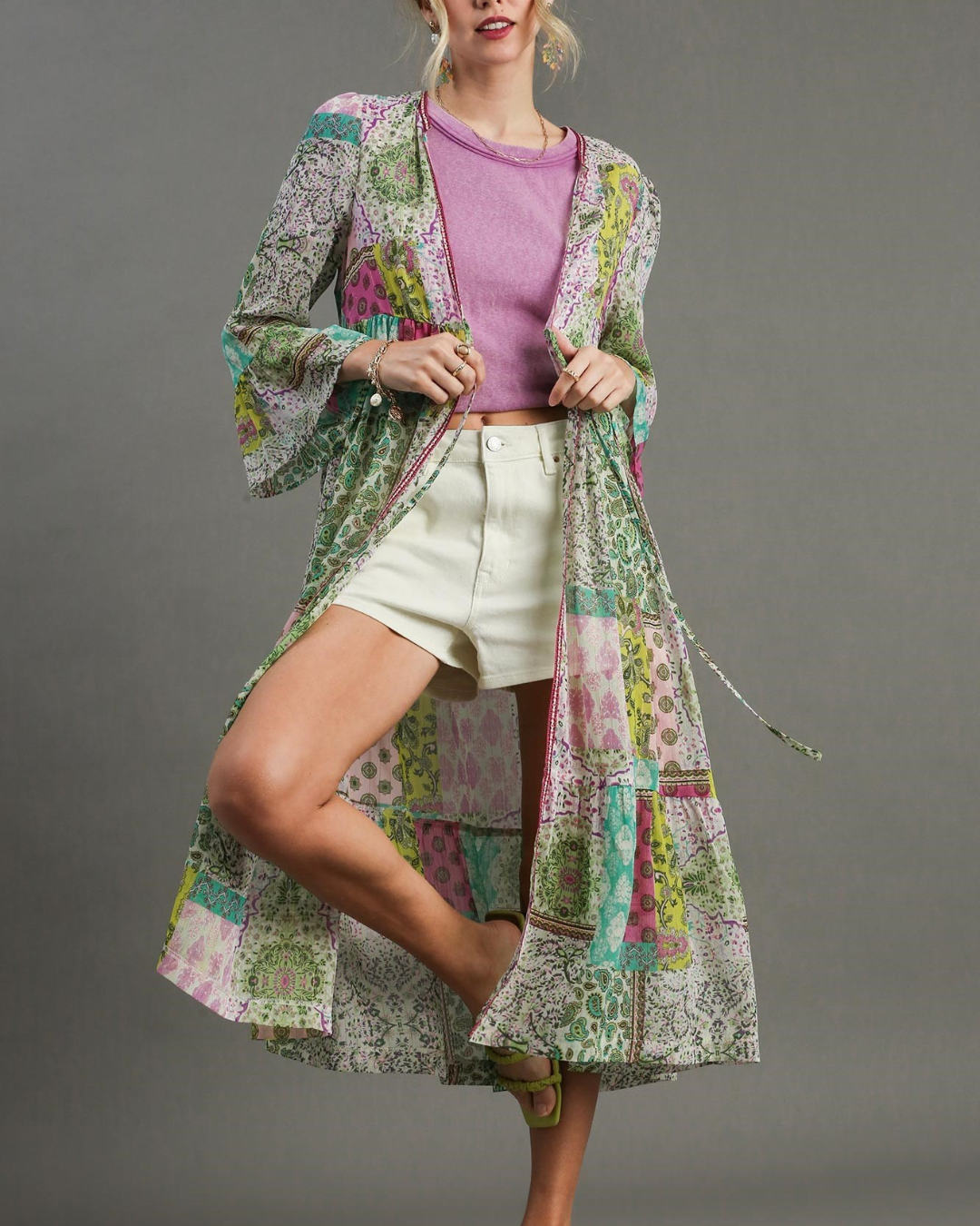 With trim detail and 3/4 bell sleeves, this tie-front kimono adds a touch of glamour to your swimwear. This coverup is your go-to for effortlessly chic beachside style.