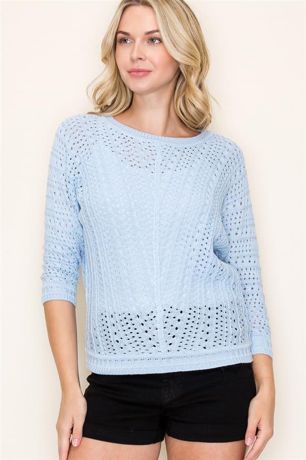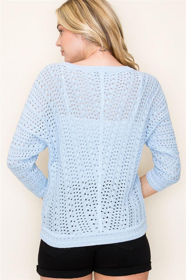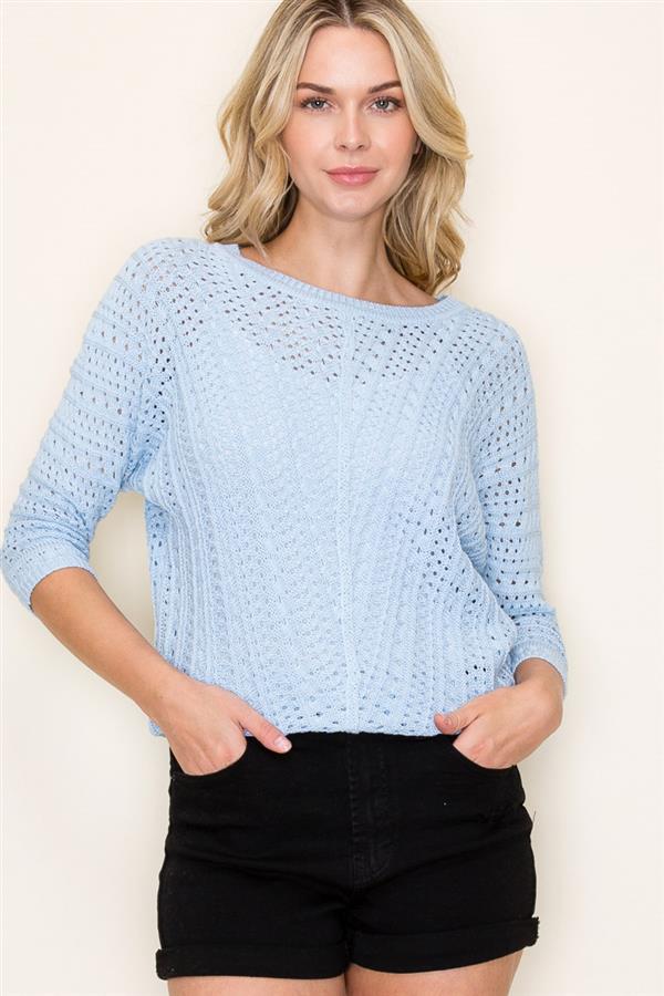 The Josephine Dolman Sleeve Crochet Pullover offers a relaxed and stylish silhouette in a beautifully crocheted design. Crafted from a comfortable blend of cotton and acrylic, this solid-colored pullover features a flattering boat neck and chic three-quarter dolman sleeves.