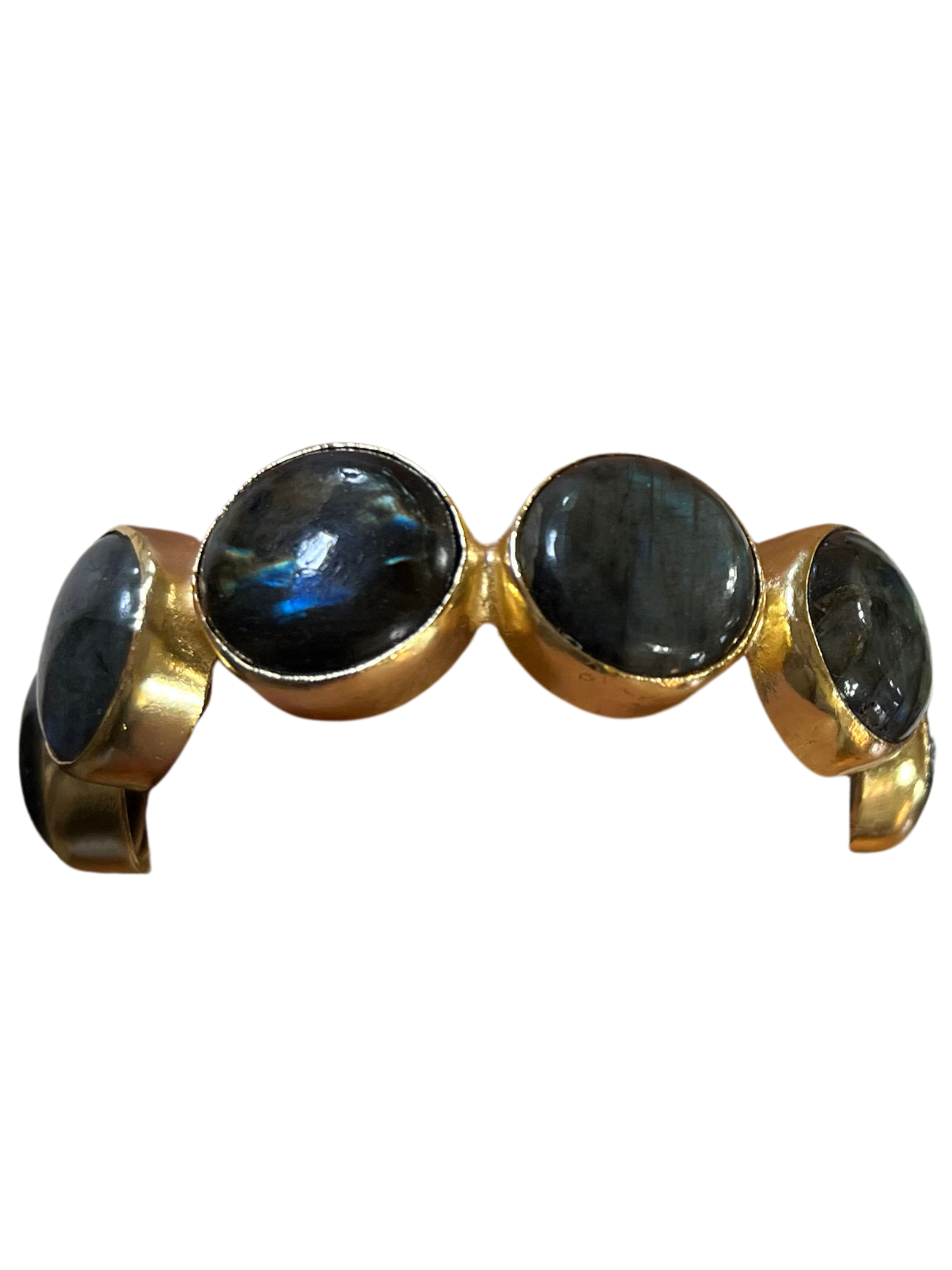 This bold cuff brings together the mystical allure of labradorite with the warmth of hand-applied gold detailing. Each iridescent stone is bezel-set and framed in a textured gold finish, catching the light with every turn of the wrist.