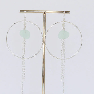 These earrings would likely have a textured, hammered finish on the silver hoop, complemented by a piece of smooth, frosted sea glass and a dangling chain element, creating a unique and potentially beachy or bohemian look.