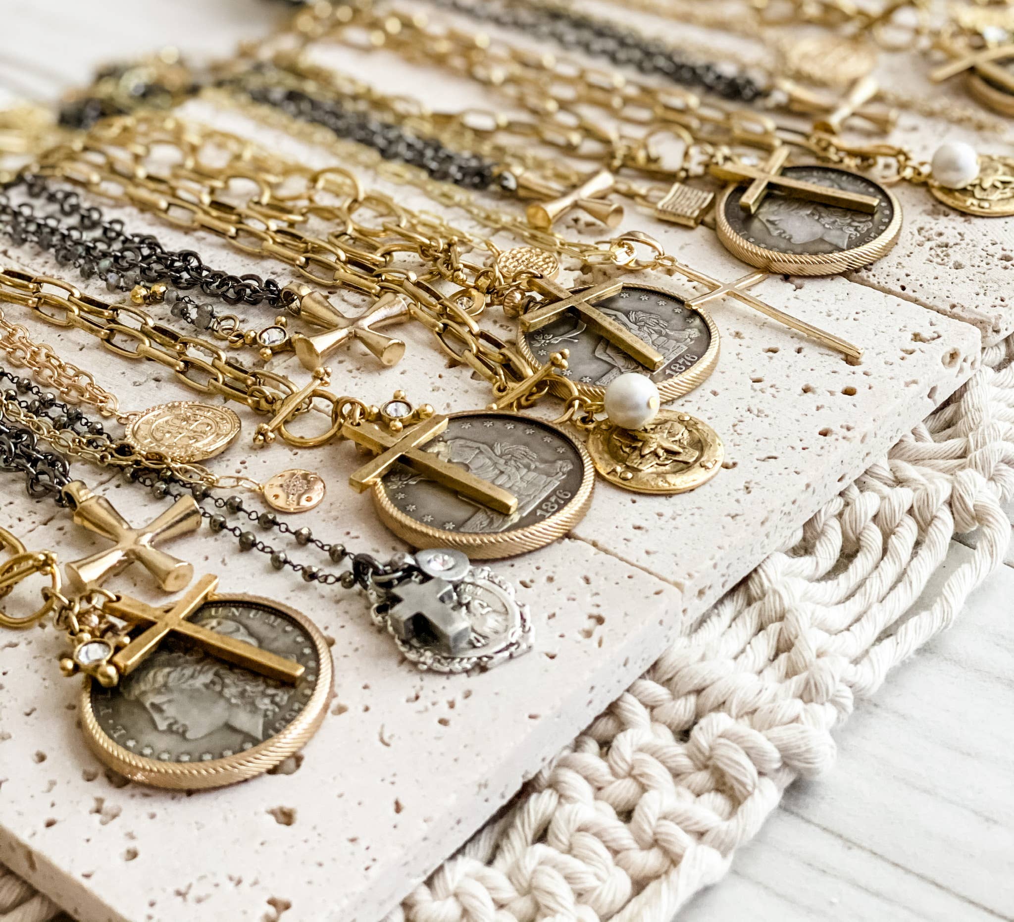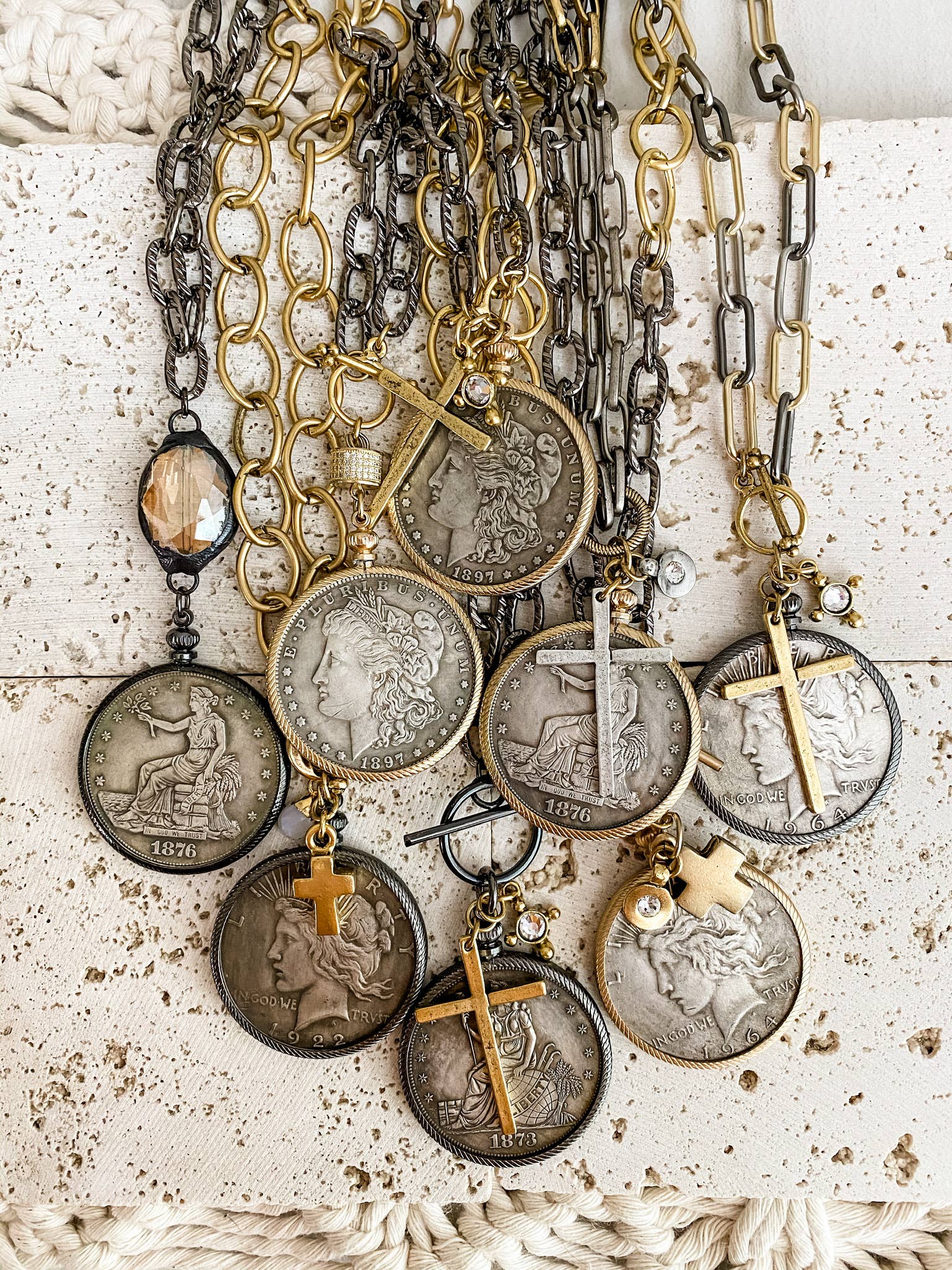 Introducing The Relic Necklace in an antique bronze finish, our newest and most captivating design that's quickly become a fan favorite. Each necklace in this collection features unique replica coin pendants, ensuring that your chosen piece will be a true standout. With multiple styles available, there's a Relic coin necklace to suit every taste and add a touch of historical intrigue to your look.
