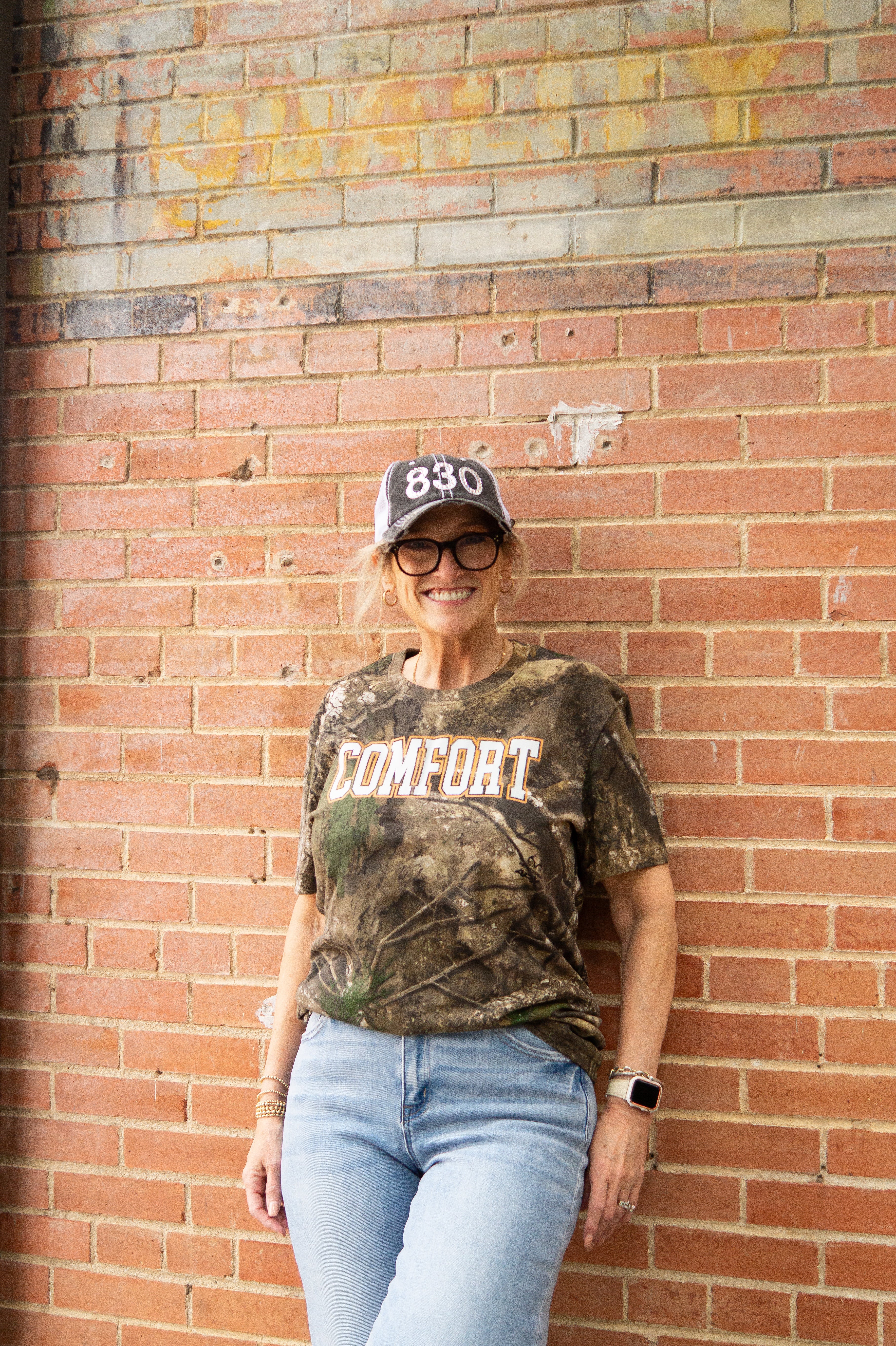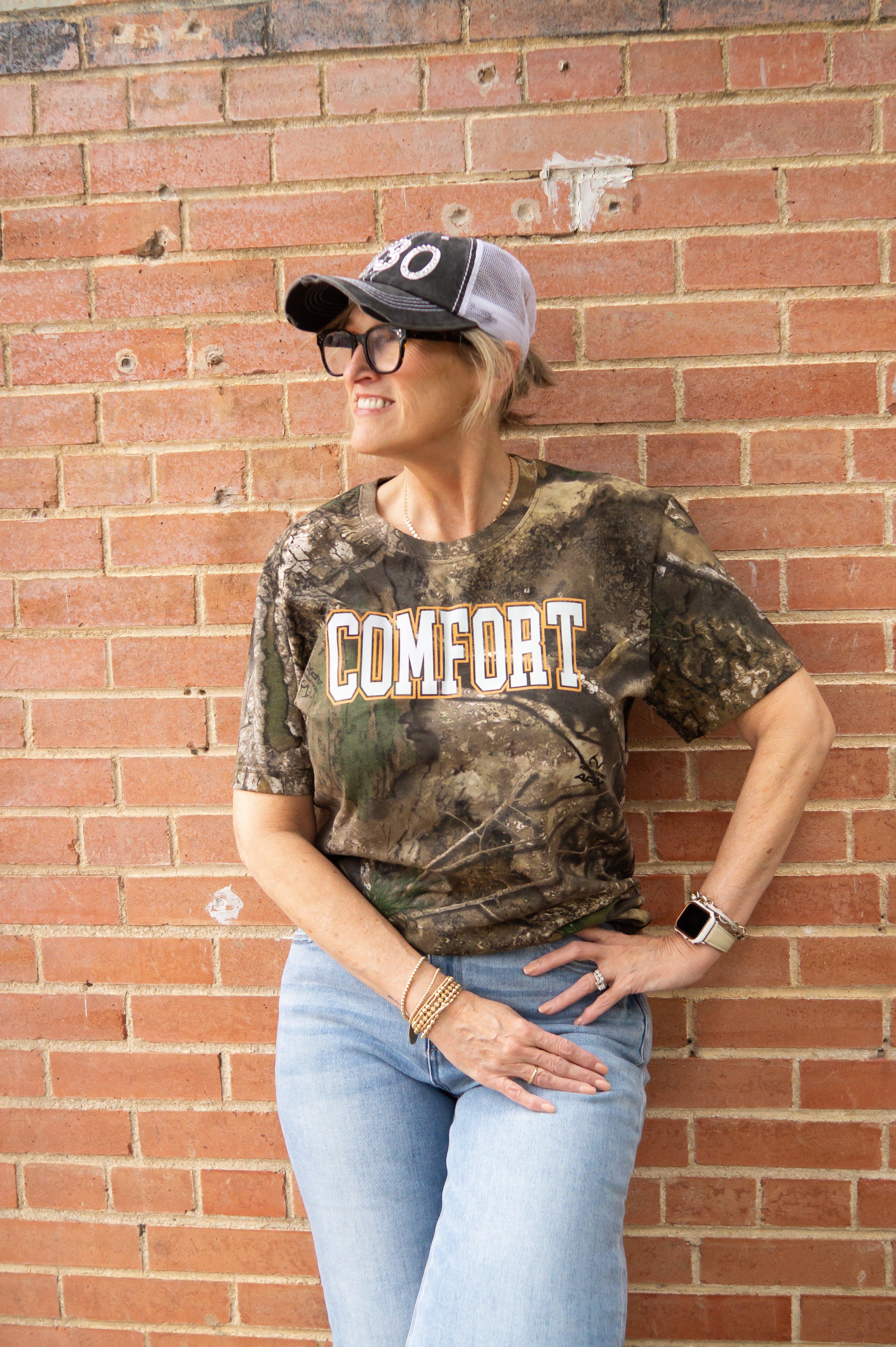 This tee isn’t just about camo, it’s about celebrating Comfort, TX, our hometown. It’s the perfect way to rep your roots while staying on-trend. Pair it with jeans and boots for a weekend look, or layer it under a denim jacket for that casual Southern vibe.