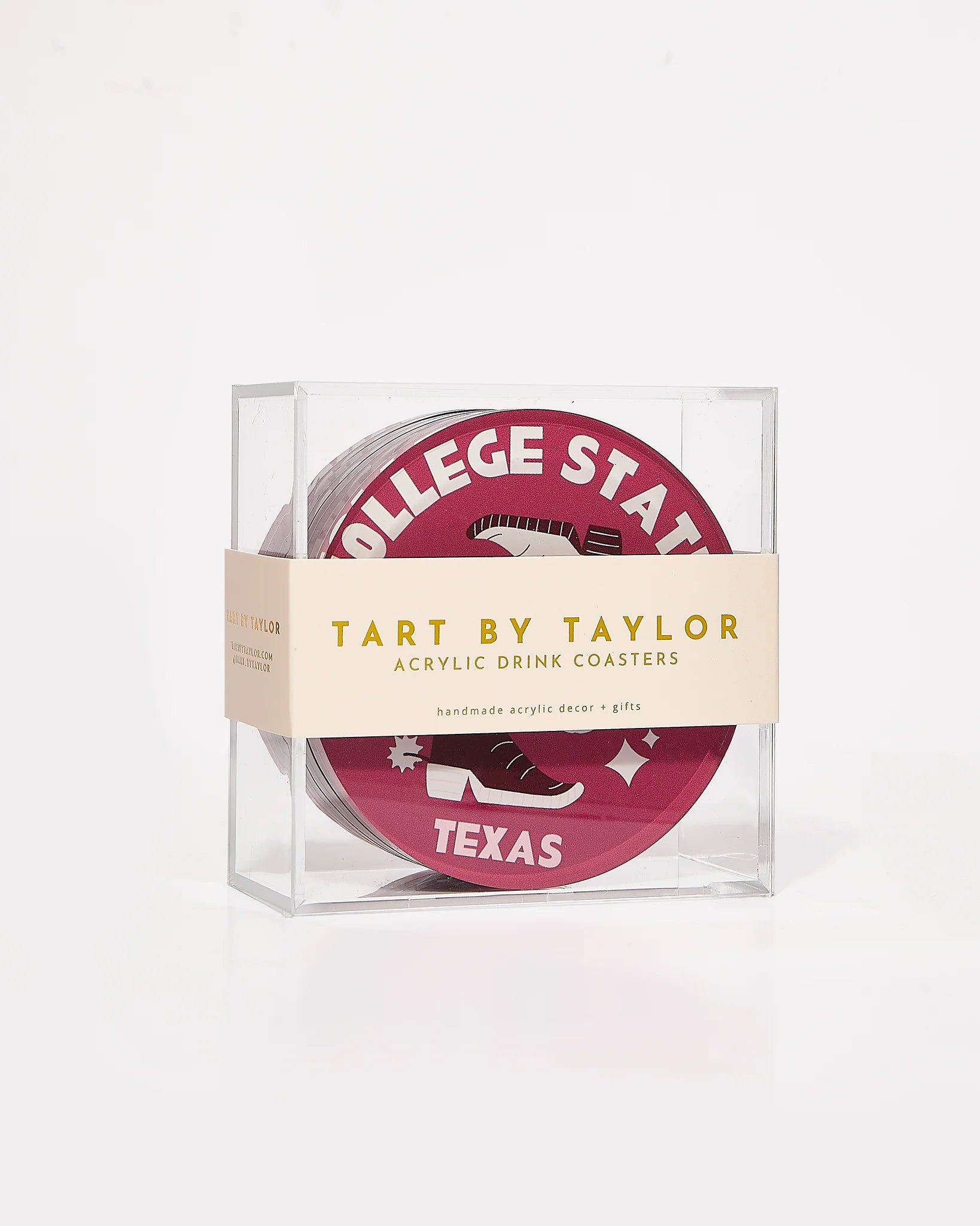 Showcase your Texas A&M University spirit with these fun and spirited College Station | Kickoff Acrylic Coasters! These playful coasters are the perfect way to protect your surfaces from drink spills while proudly displaying your Aggie pride. Gig 'em!