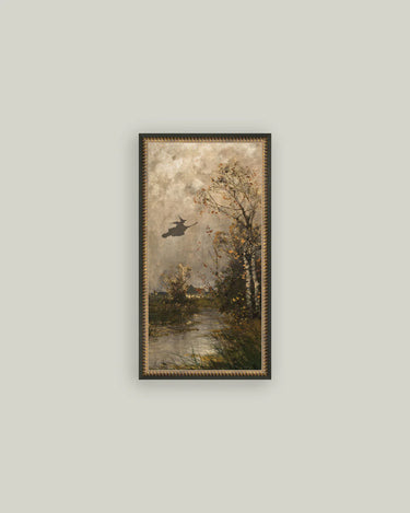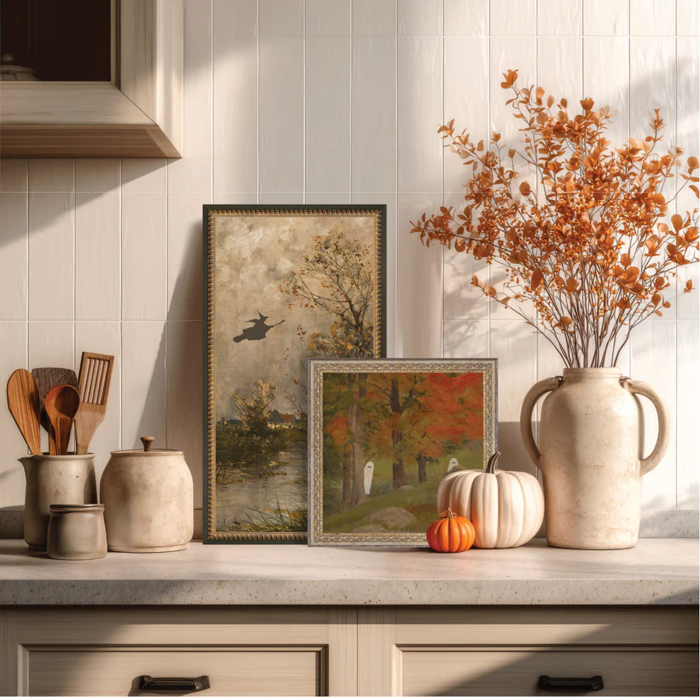 The Flying Witch Landscape captures the enchantment of a witch soaring under moonlit skies, bringing drama and charm to your seasonal décor. Printed on canvas and framed in an 11x20 ridged brass brown frame, this wide-format piece makes a statement whether styled above a mantel, layered in a gallery wall, or as the centerpiece of your Halloween display.