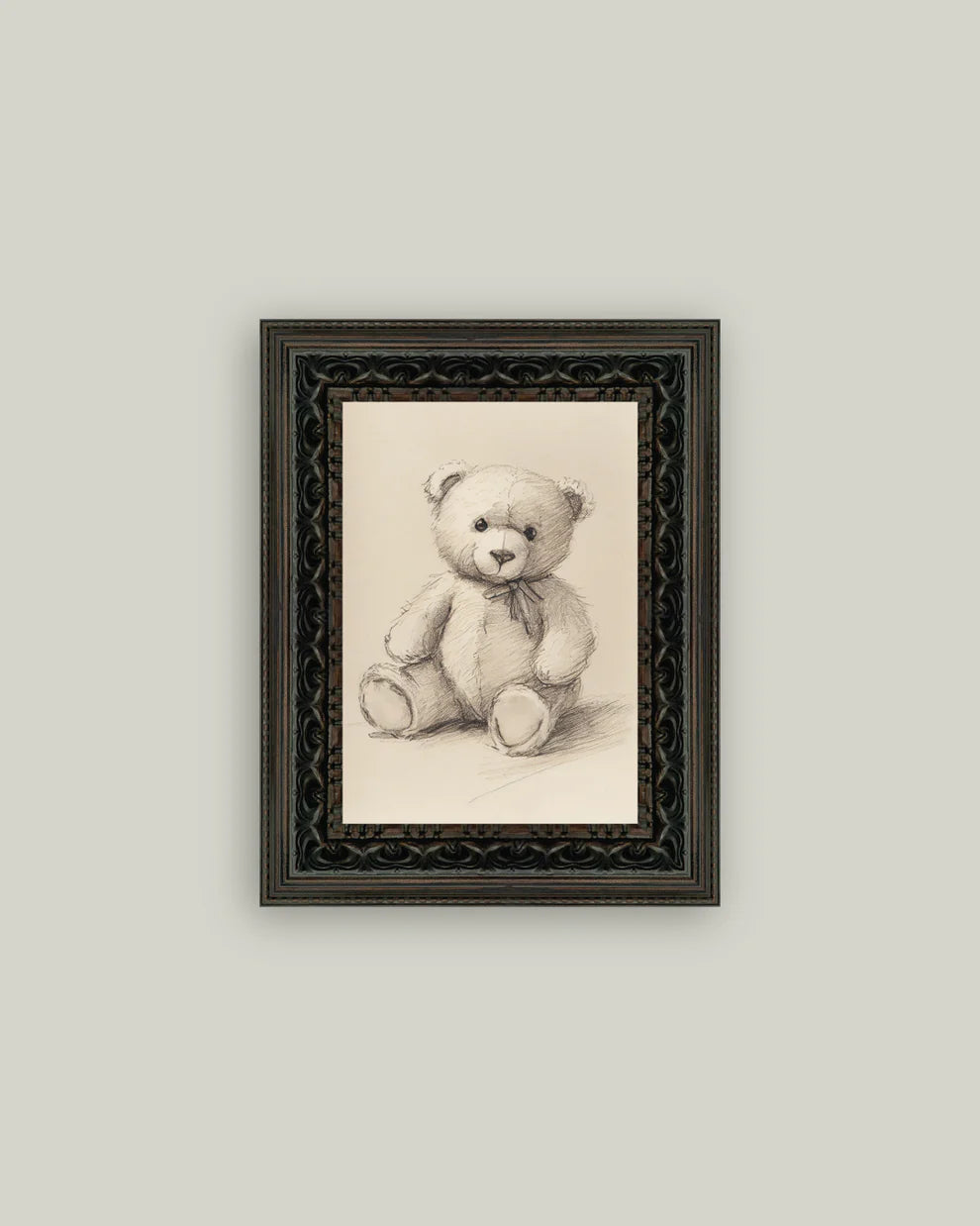 The Teddy artwork is printed on raw canvas and placed in a 5x7 fancy brown frame, giving it an antique, heirloom-style finish. With its warm tones and vintage-inspired design, this piece evokes the sweetness of childhood memories and adds a cozy, collected feel to your home décor. Perfect for nurseries, shelves, or as part of a layered gallery wall.