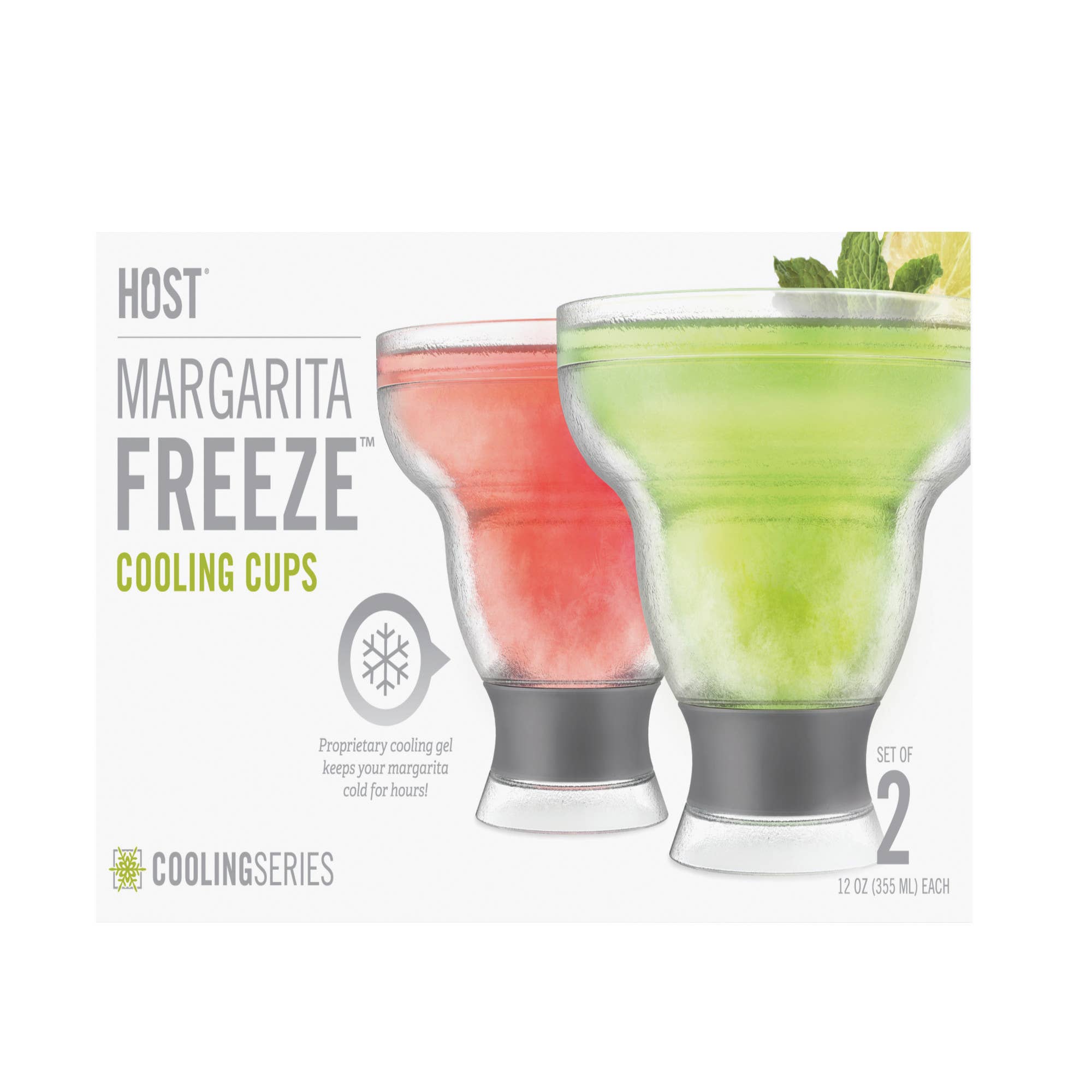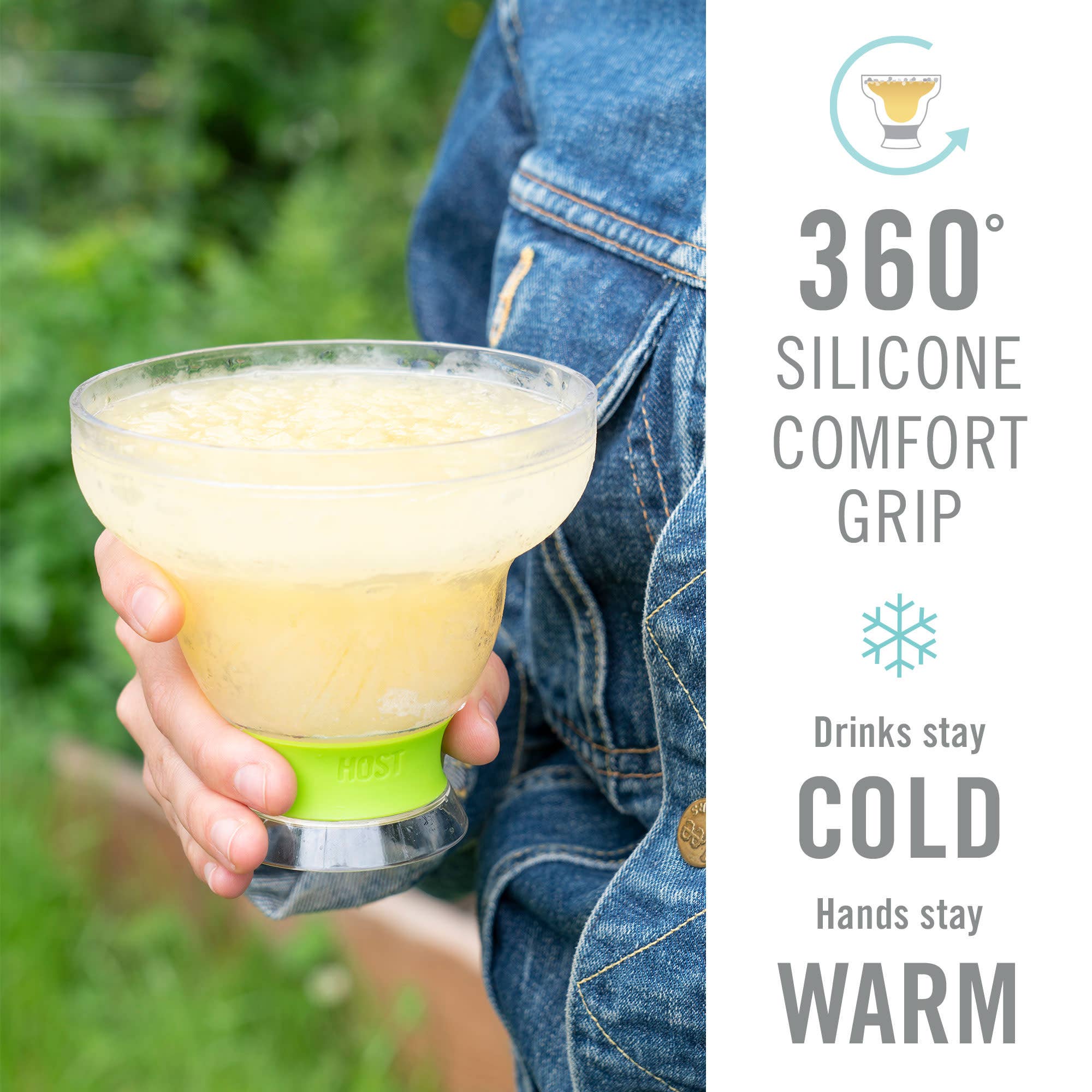Each cup holds 12 oz. and features a soft, insulated silicone grip to keep your hands cozy while your cocktail stays crisp.