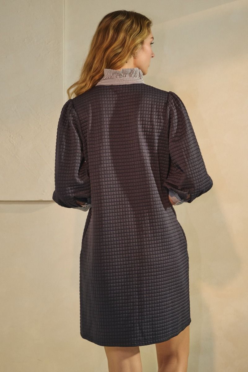 The Gemeni Dress is a quilted navy shift silhouette elevated with thoughtful details: a contrast striped ruffled collar, matching cuffs, and a button placket that add just the right amount of personality. With its relaxed fit and soft stretch, this dress is as comfortable as it is chic, perfect for workdays, brunches, or special occasions that call for effortless polish.