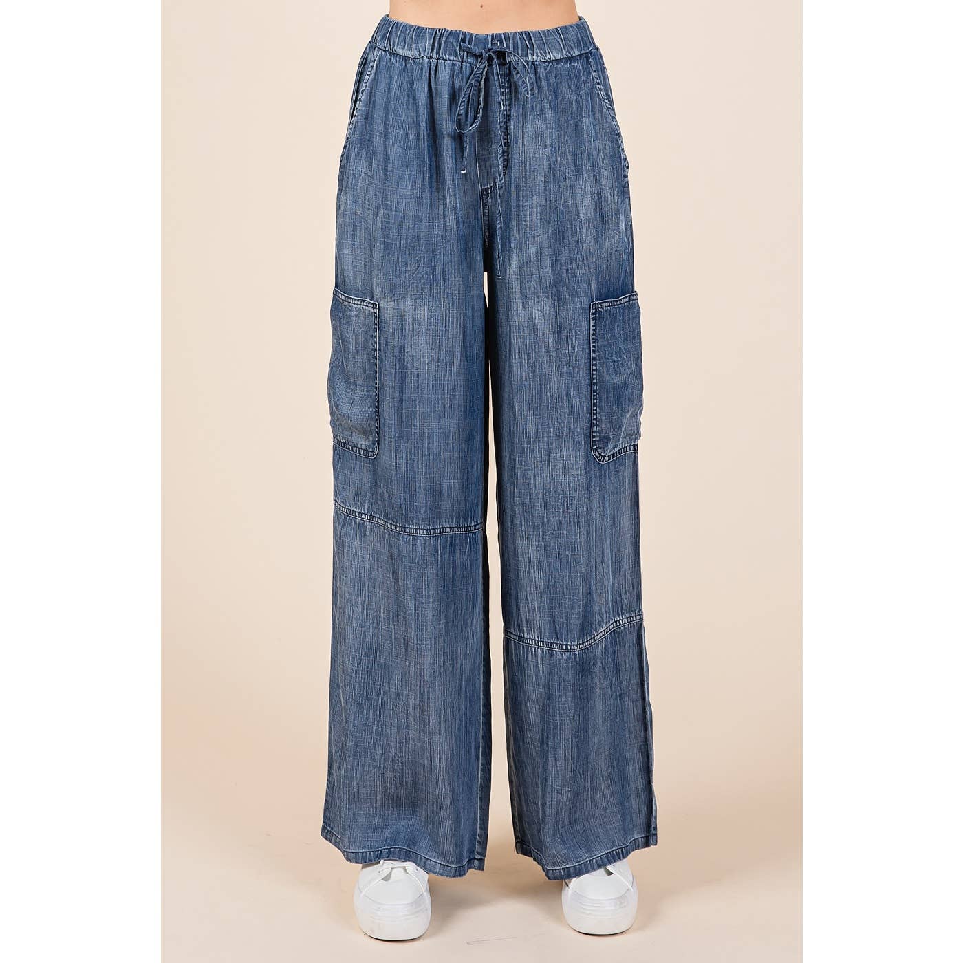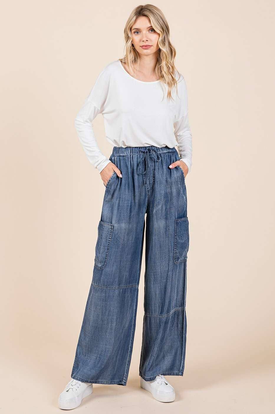 Effortless, lightweight, and endlessly wearable, the Samantha Washed Chambray Drawstring Wide Leg Pants are your go-to for laid-back style with a polished touch. Made from soft washed Tencel chambray, these full-length pants feature a relaxed fit and wide leg silhouette that moves beautifully. The elastic waistband with an adjustable drawstring ensures a comfortable fit, while multiple pockets add both function and charm.