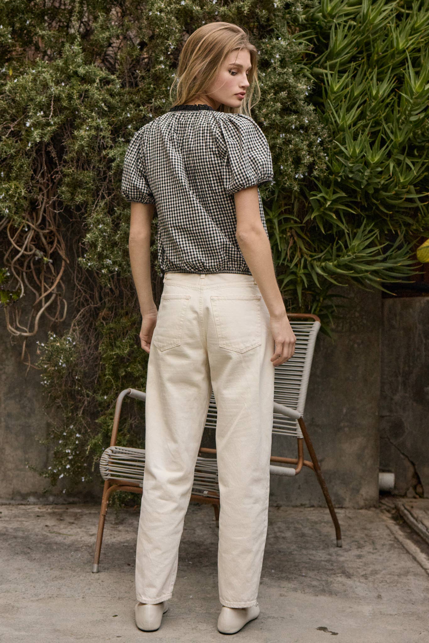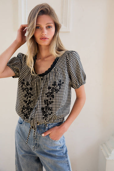 Bianca is giving sweet, classic, and a little flirty, all at once. The black and white gingham feels timeless, while the floral embroidery on the front adds that boutique-pretty touch that makes this top feel special. With puff sleeves, a softly gathered scoop neckline, and an elastic hem, it’s made to sit just right with high-waisted denim, shorts, or a skirt.