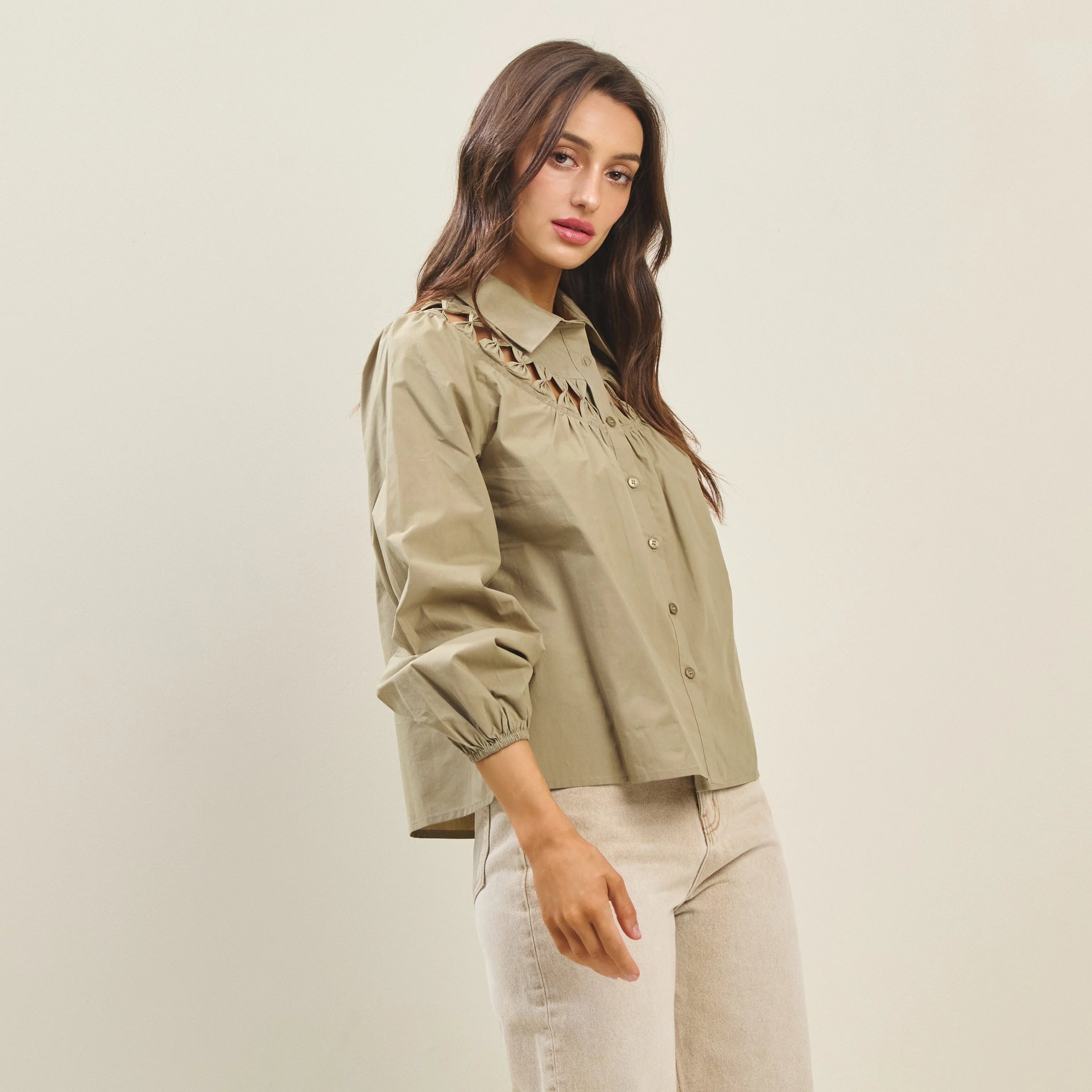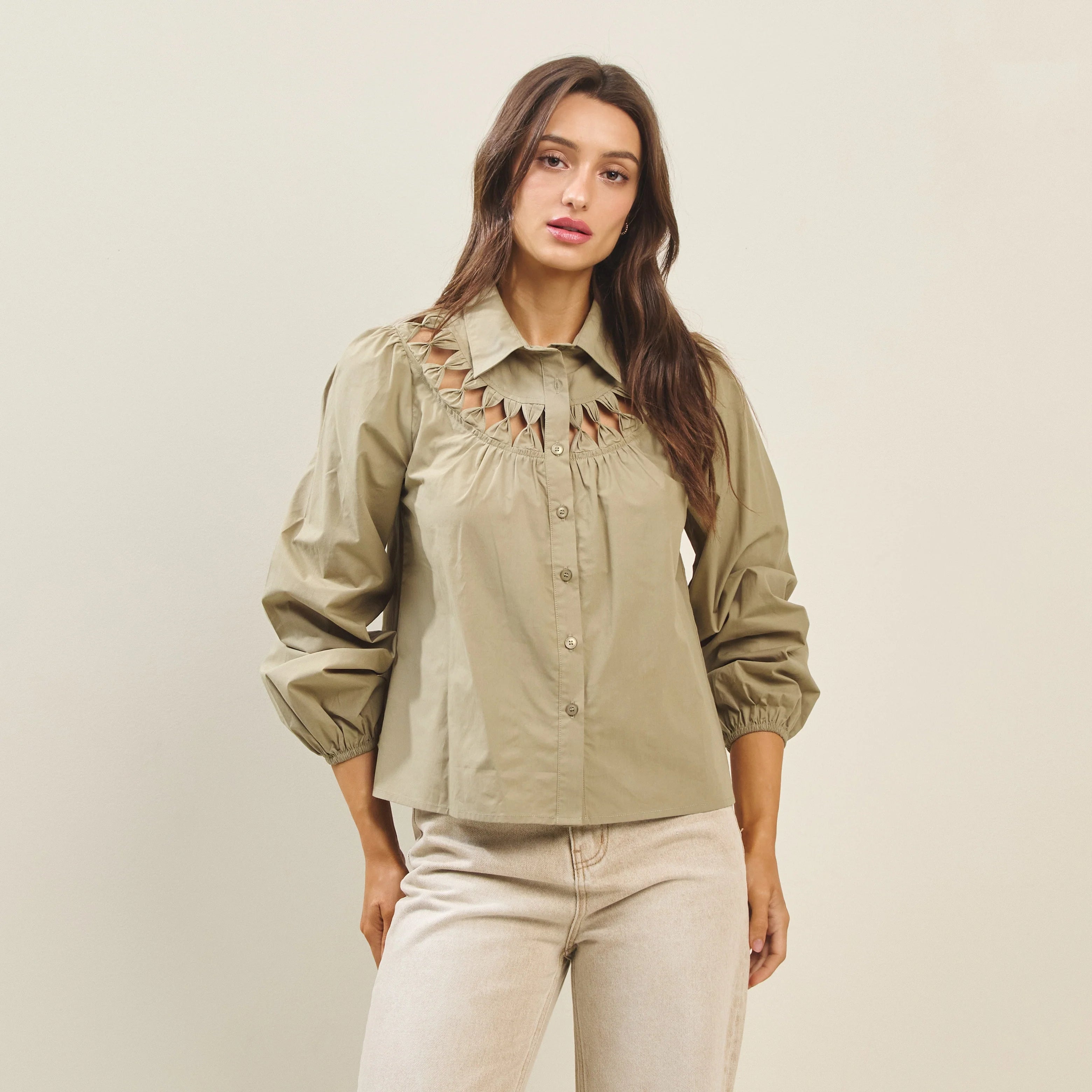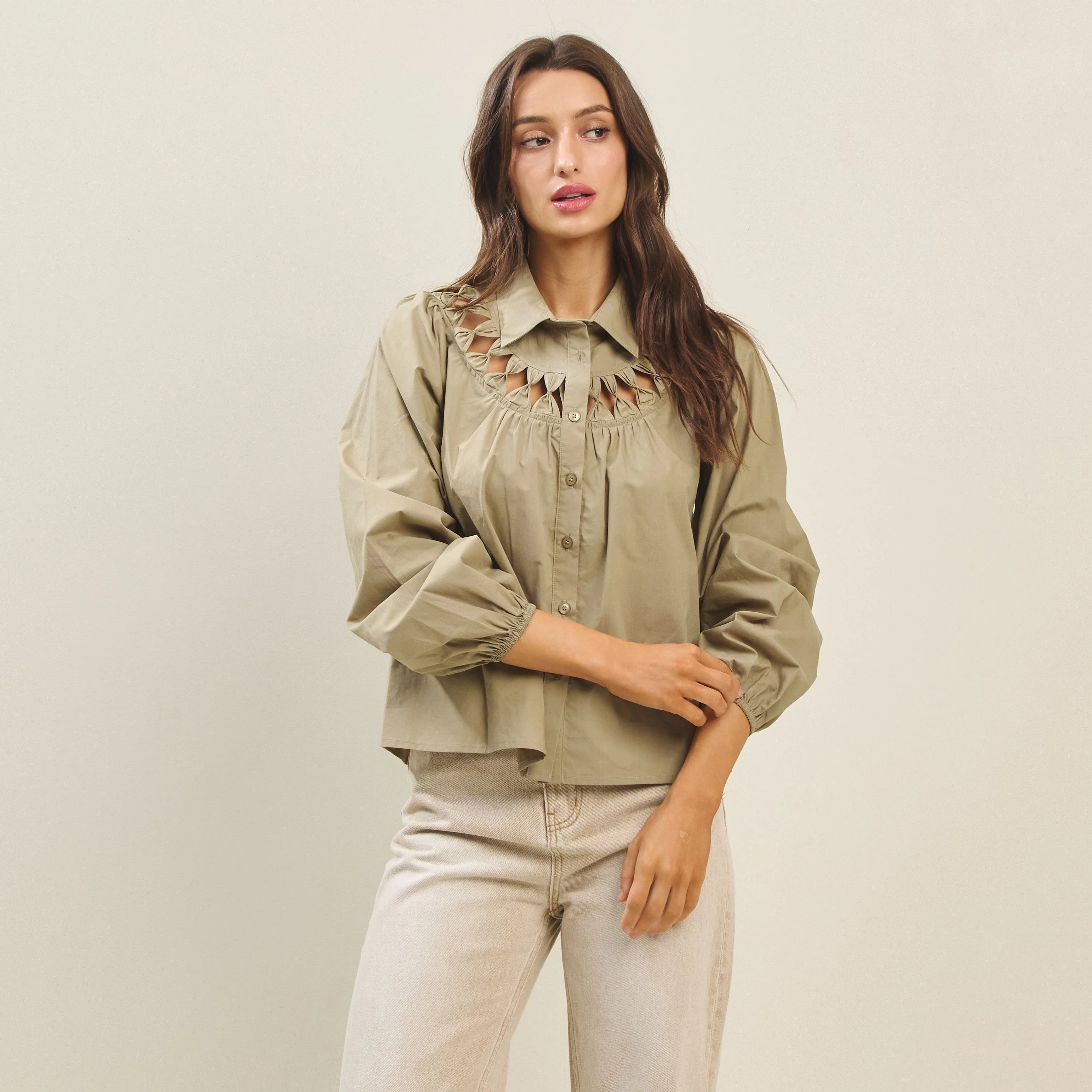 Chic meets eye-catching in the Gretchen Cutwork Blouse, designed with beautiful cutout details and a classic button-down silhouette. The long sleeves and relaxed shape make it easy to style for work, dinner, or weekend outings. Whether tucked into denim or paired with dressy trousers, it brings instant polish wherever you go.