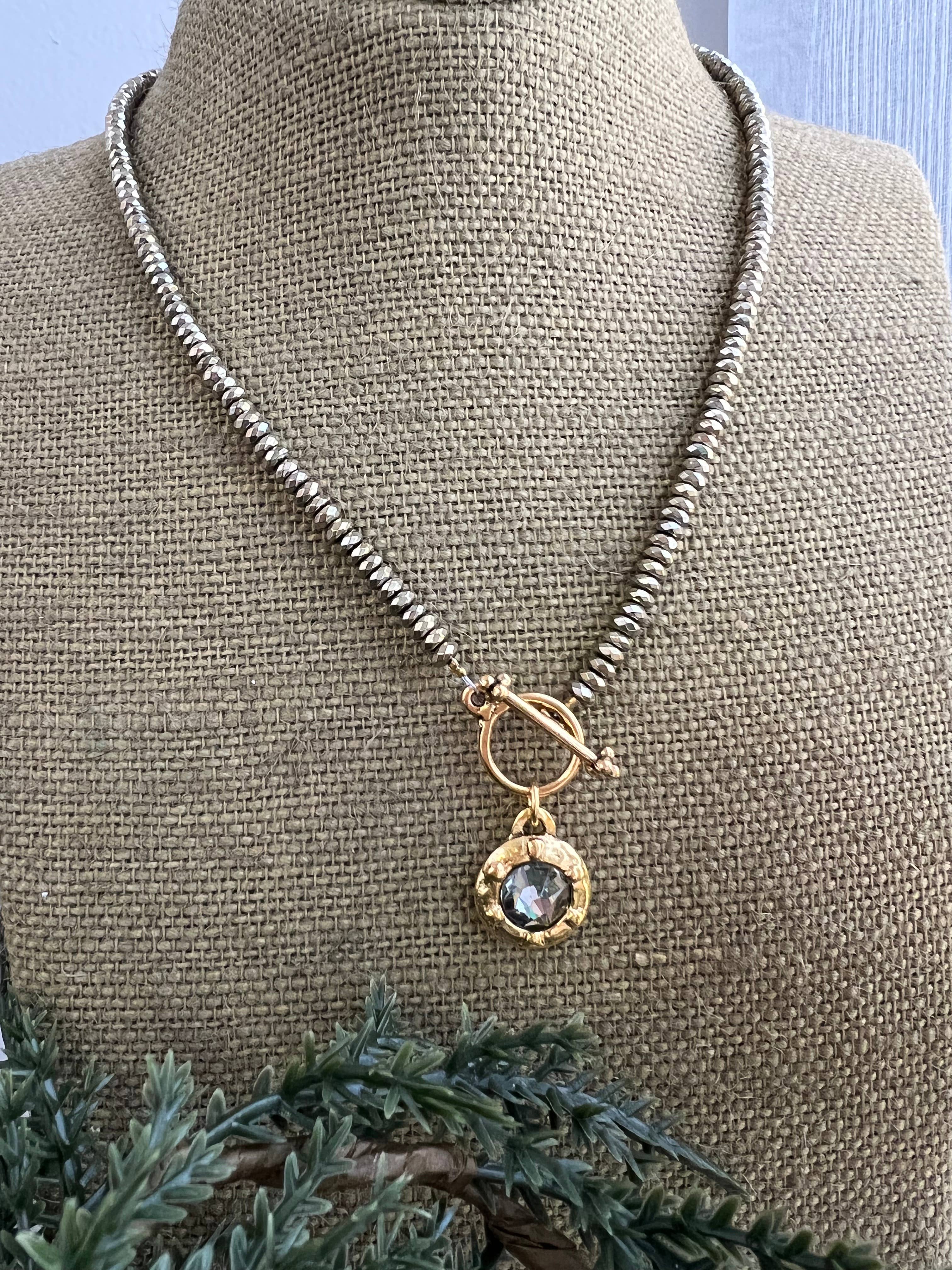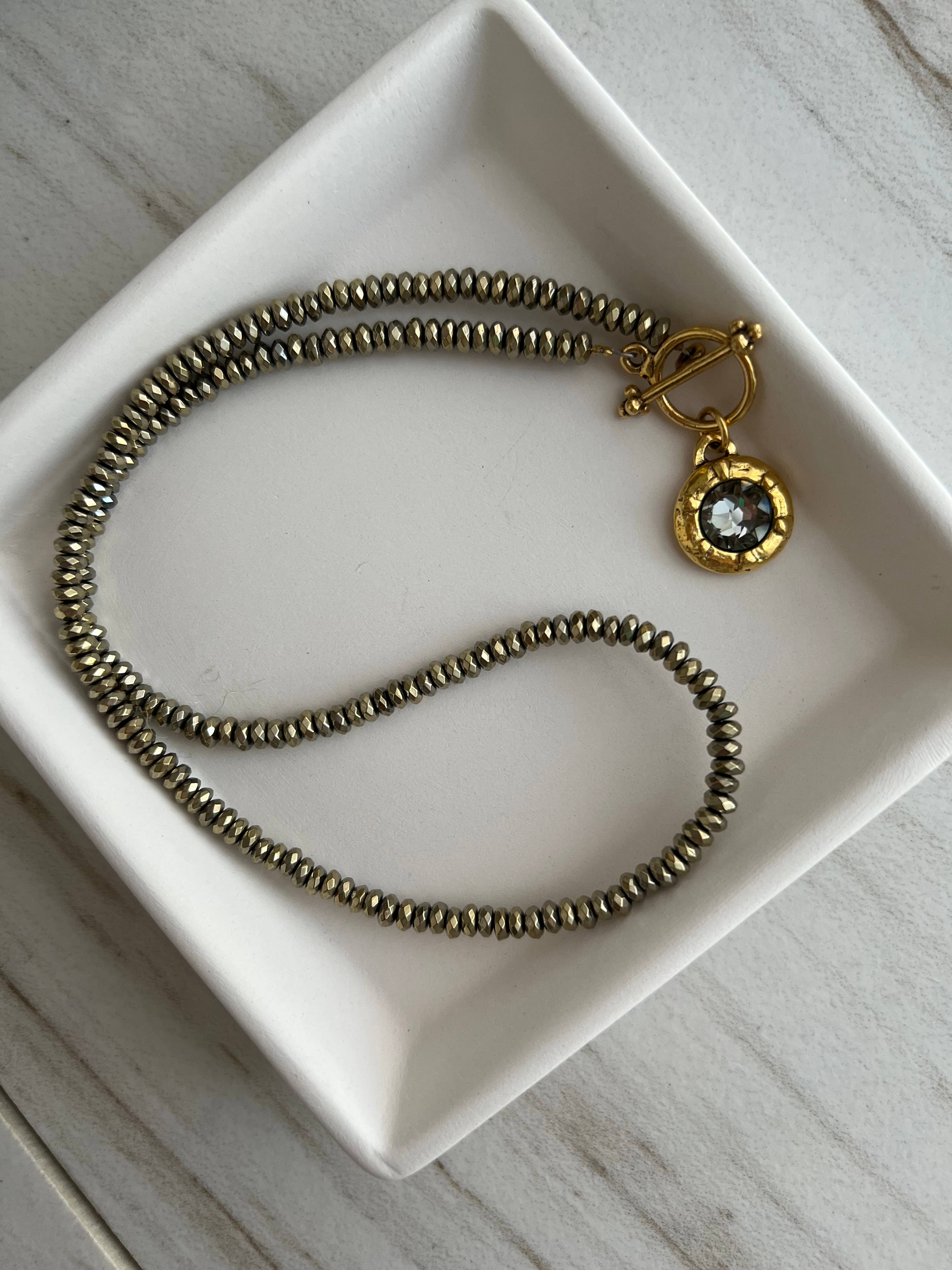 Embrace the beauty of darkness and light with the Longest Night Necklace. This exquisite piece features a Pyrite stone and a dark gray Swarovski crystal pendant, symbolizing the transition from darkness to light.