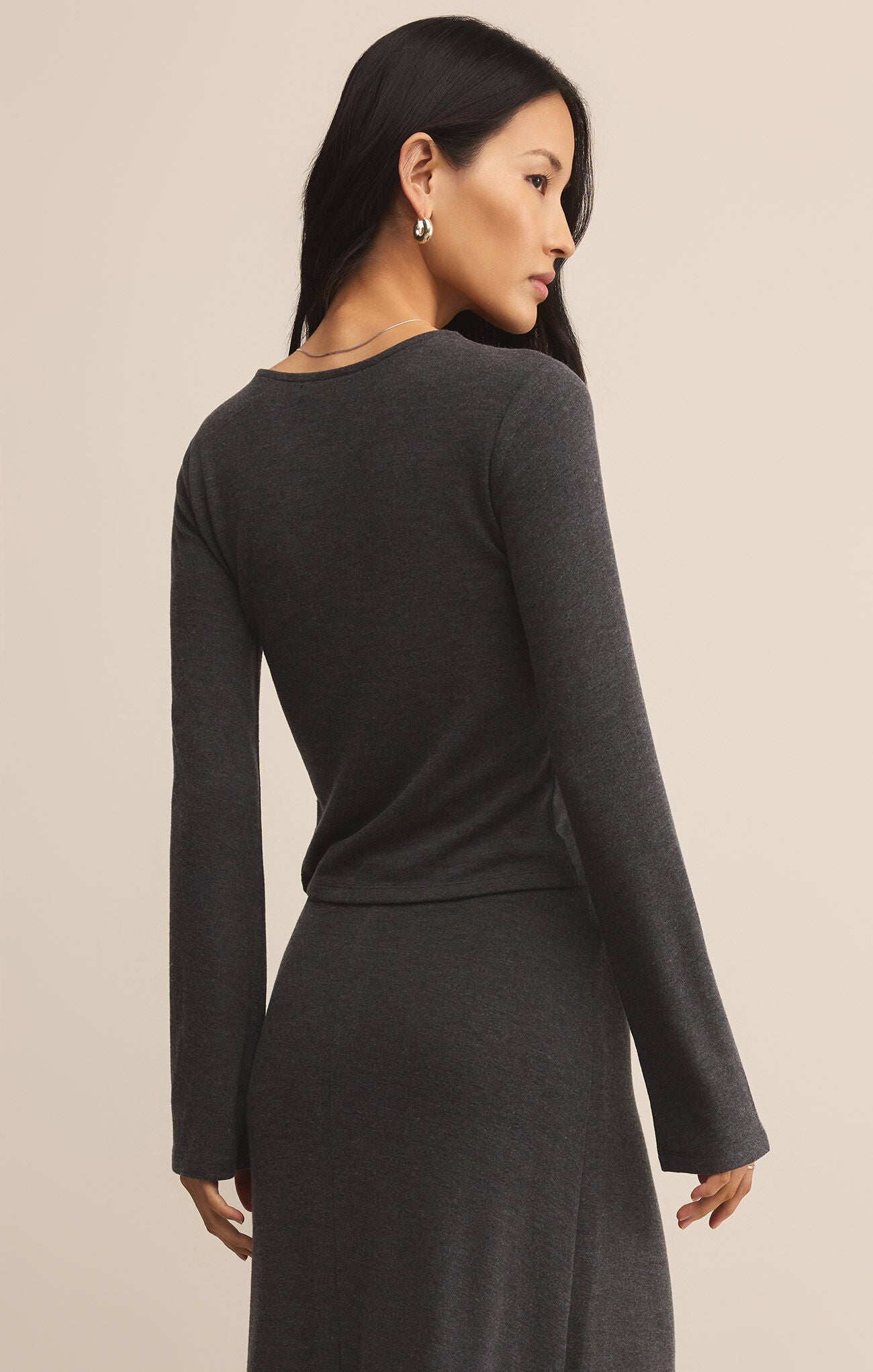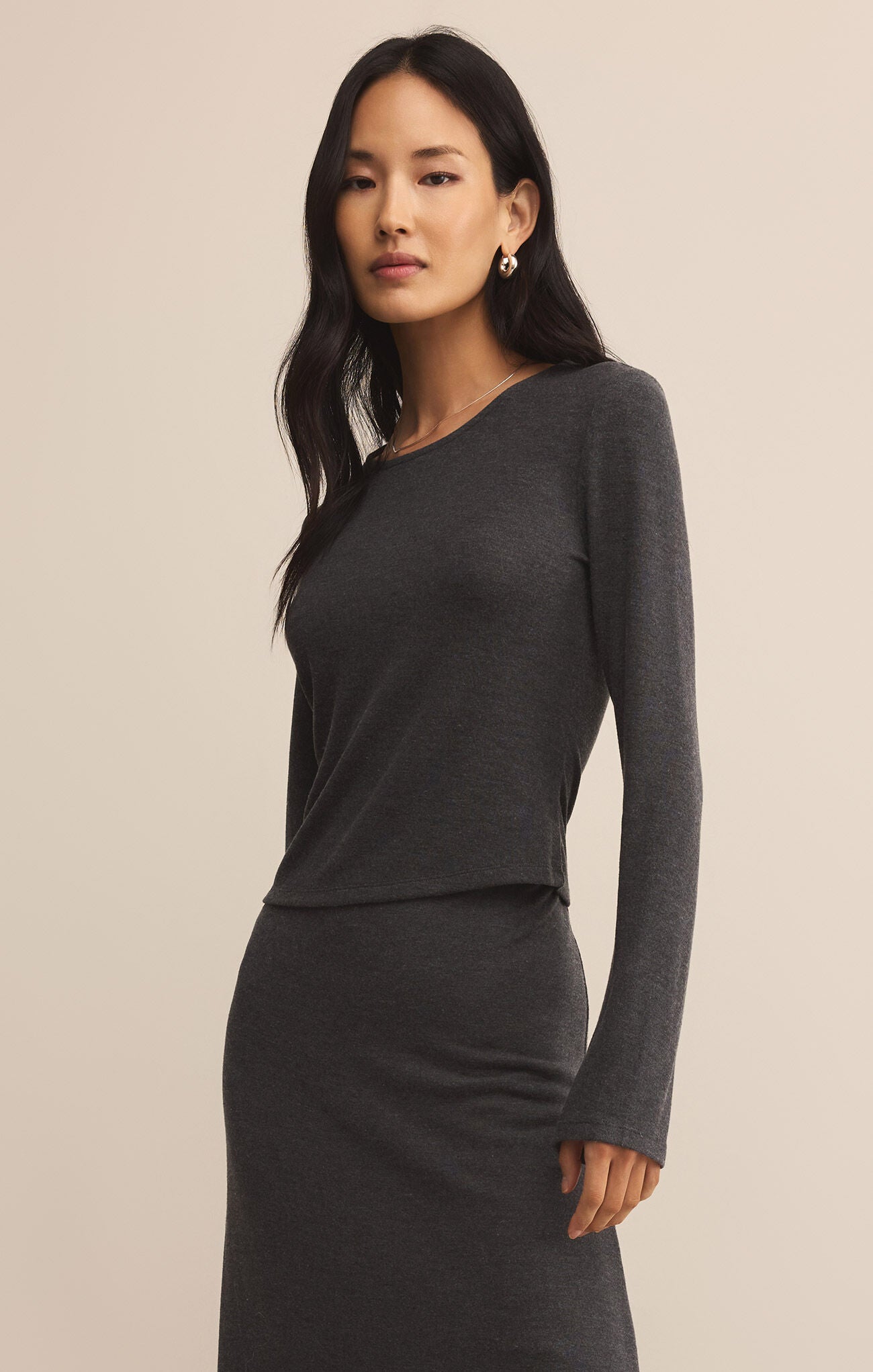 The Demure Top is that perfect mix of cozy and polished. Made from a brushed jersey blend with just the right amount of stretch, this fitted long sleeve flatters with a crew neckline, cropped length, and subtle fluted sleeves. Lightweight yet cozy with a heavy soft wash, it layers beautifully under jackets or cardigans, while looking chic enough to wear solo.