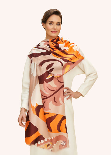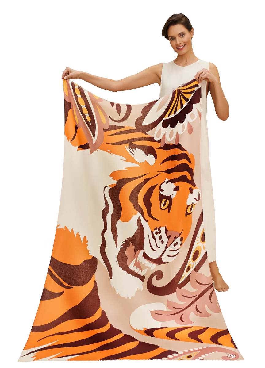Turn everyday styling into a statement with the Thrill of the Tiger Scarf. Designed in our Edinburgh studio, this striking piece transforms the scarf into a large-scale canvas, showcasing intricate artwork that celebrates strength and beauty. At 184 cm x 100 cm, it’s luxuriously oversized, making it versatile enough to wear draped, wrapped, or even styled as a lightweight shawl.