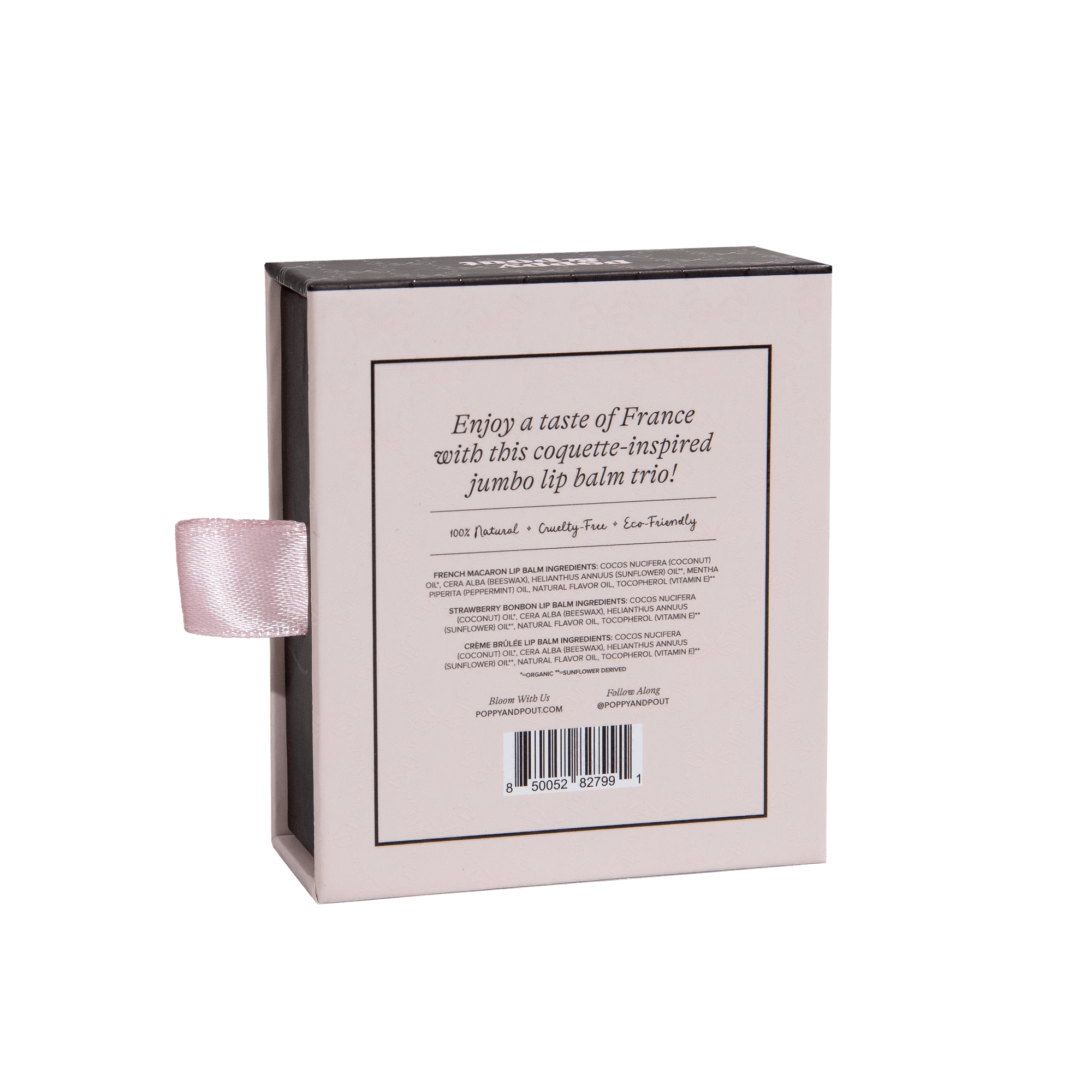 Sweet, charming, and oh-so-French. The Coquette Lip Balm Trio Gift Set features three decadent, dessert-inspired lip balms—French Macaron, Strawberry Bonbon, and Crème Brûlée—all wrapped up with a bow and ready to gift.