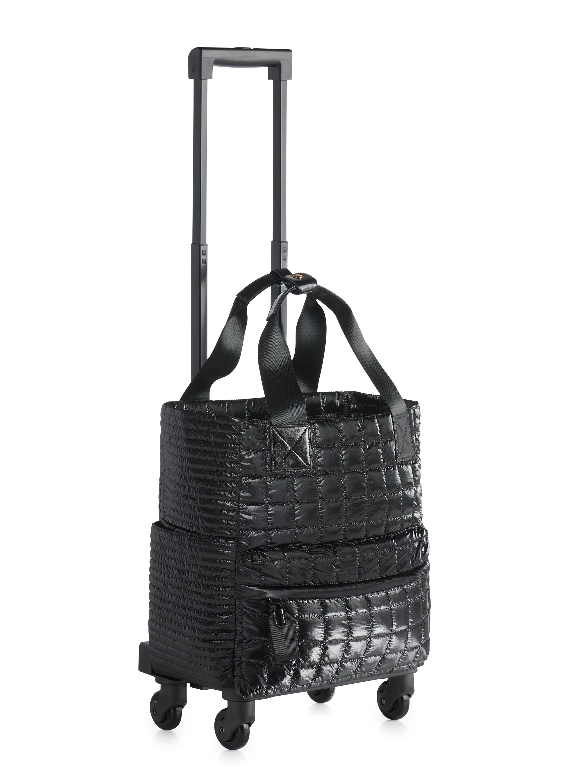 The Logan 360º Roller Tote is designed for the woman who doesn’t want to sacrifice style for function. Crafted from quilted metallic nylon, it’s both eye-catching and incredibly practical. Smooth 360° spinner wheels and an extending roller handle make navigating airports, sidewalks, and hotel lobbies feel effortless—while the sleek silhouette turns every head along the way.
