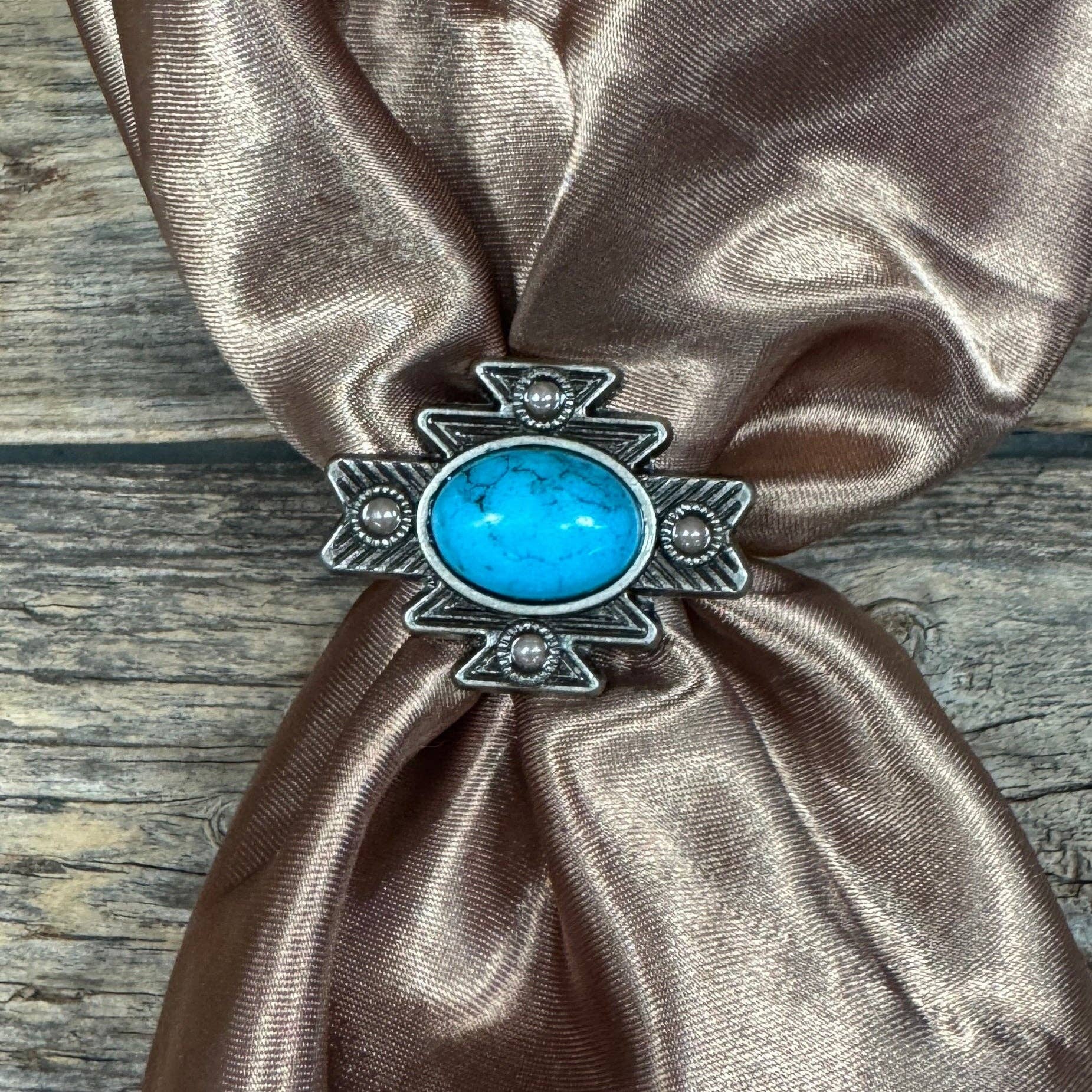 This beautiful Aztec-inspired wild rag slide adds a timeless western touch to any scarf style. Crafted in an antique silver finish, the unique concho shape is accented with coral stones and finished with a striking turquoise center. It’s a statement piece that feels classic, detailed, and effortlessly versatile.