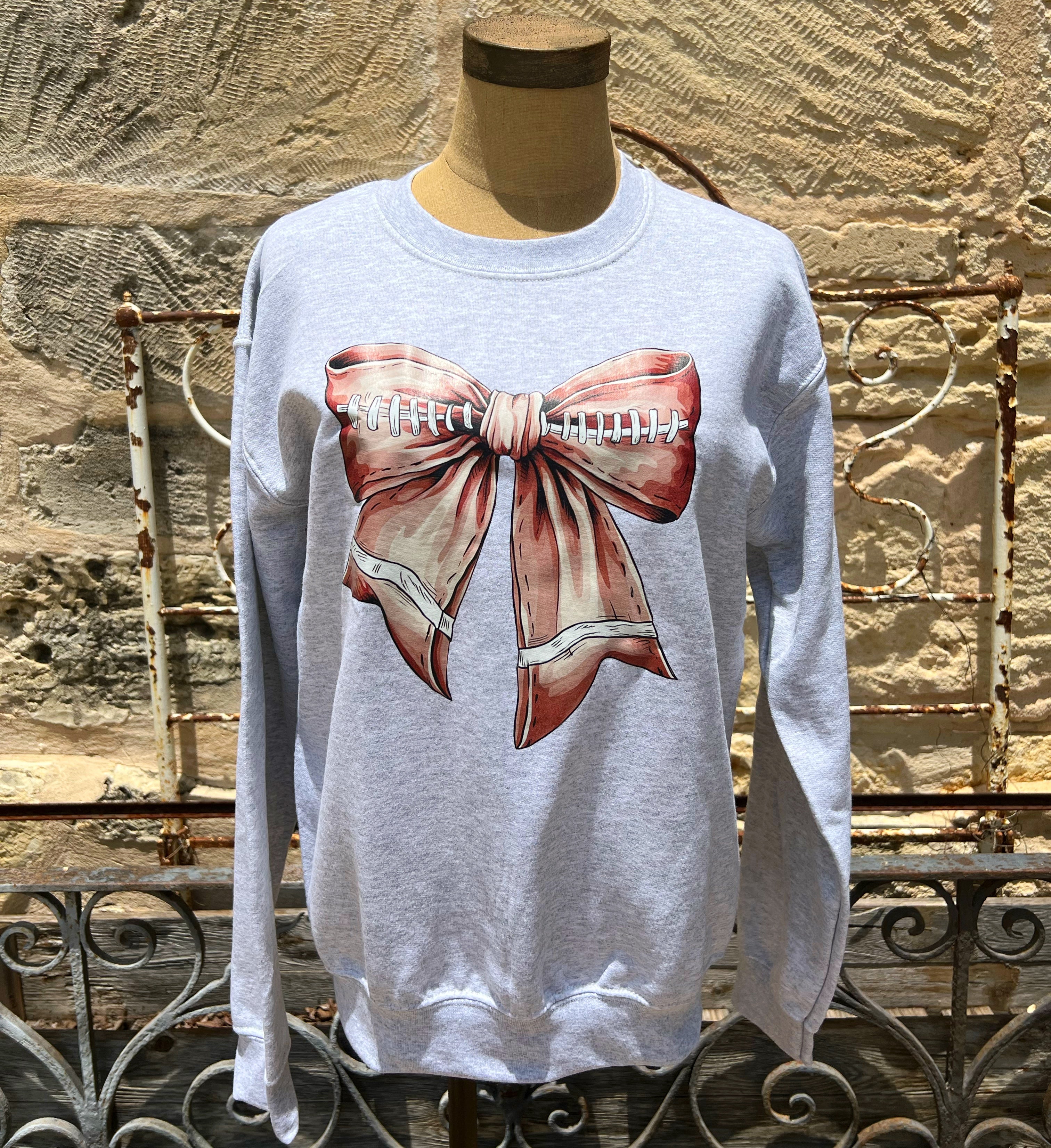 Show your team spirit in style with this adorable grey sweatshirt featuring a cute football bow. Perfect for any football fan who wants to add a touch of femininity to their game-day attire.