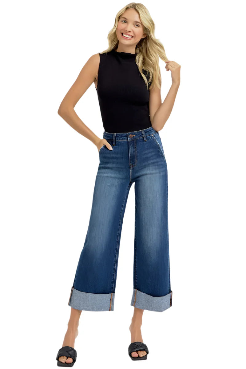 The Gwen Jeans by Risen combine classic style with a flattering fit you’ll love. Designed with tummy control for smoothing and shaping, these high-rise jeans feature a wide cuffed ankle for a fresh, modern touch. The blend of cotton, polyester, and spandex ensures comfort and stretch, making them your go-to for everything from coffee runs to dinner out.