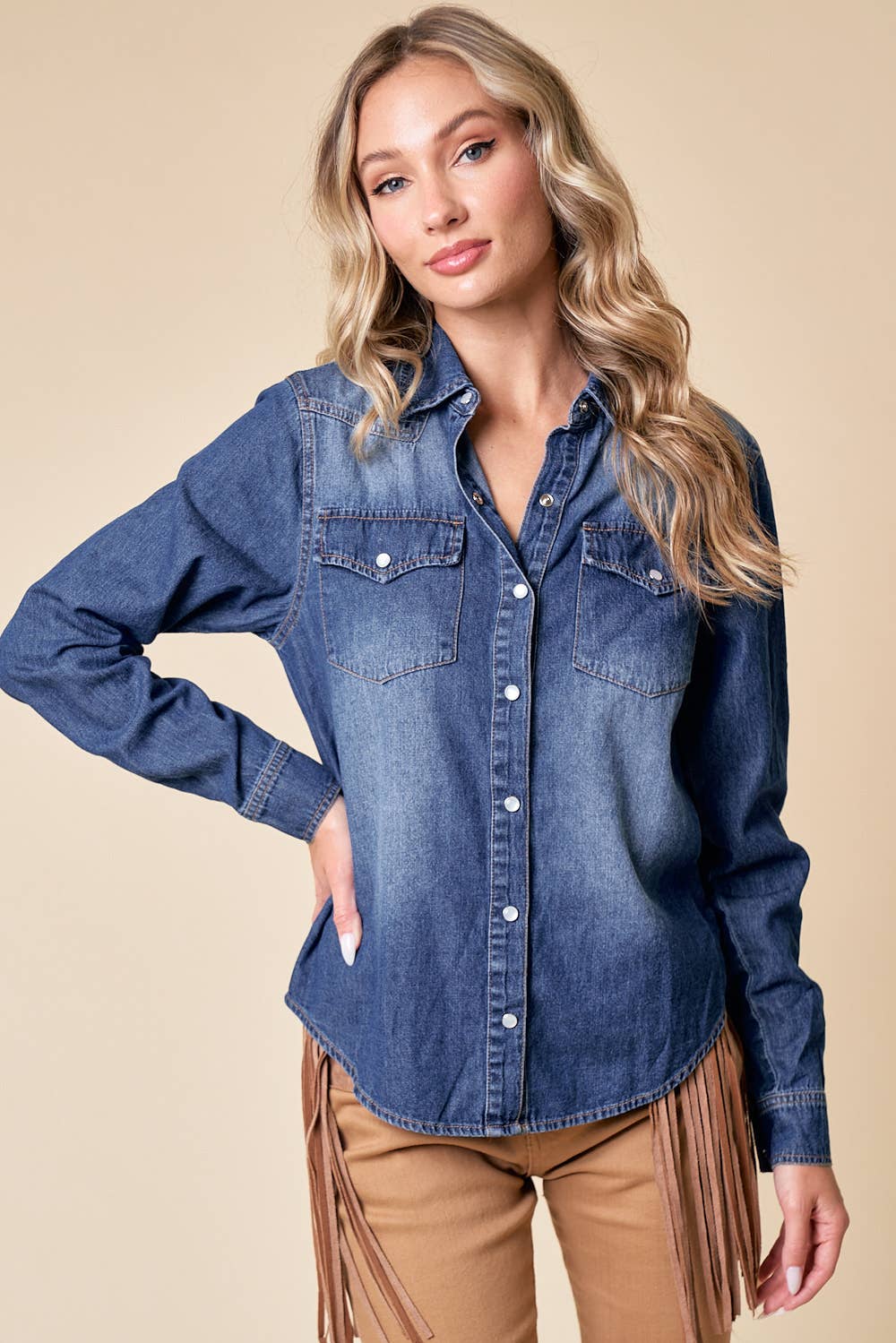 Classic western charm meets modern style in the Josephine Dark Pearl Snap Denim Shirt. Crafted from lightweight denim, this timeless button-down features western-inspired pearl snap buttons, chest pockets, and a relaxed fit that makes it as flattering as it is comfortable. Whether you’re headed to a rodeo, a concert, or a casual night out, this shirt brings a touch of effortless cowgirl confidence to your look.