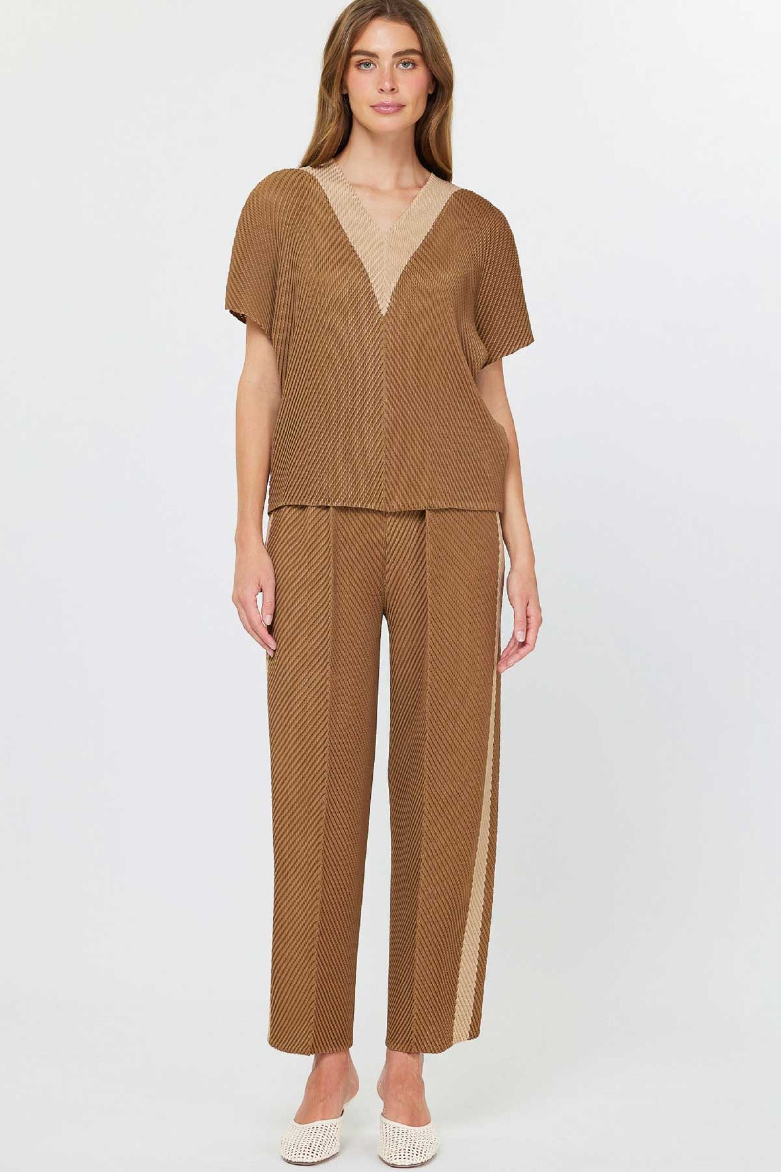 The top showcases a bold contrast V-neckline and relaxed dolman sleeves, while the matching pants feature a clean, straight hem for a polished finish. The diagonal pleat pattern adds depth and dimension, creating a cohesive, fashion-forward silhouette. Whether you're headed to brunch, the office, or catching a flight, this lightweight, wrinkle-friendly set is as versatile as it is stylish.