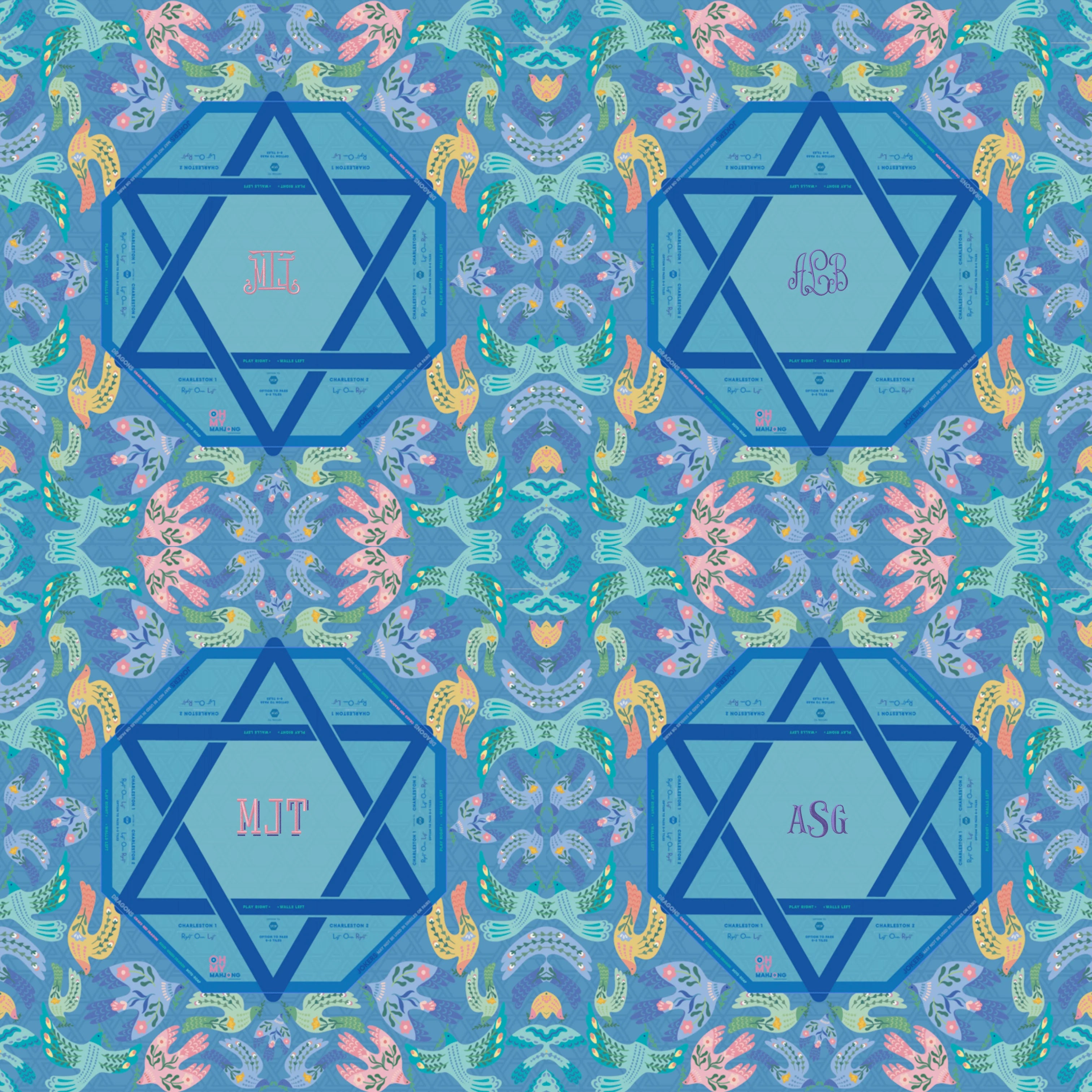 Celebrate tradition, connection, and joy with the Shalom Mahjong Mat. Designed with a vibrant palette of blues, yellows, greens, and pinks, this mat features delicate bird motifs and the Star of David, bringing both beauty and meaning to your Mahjong nights. Whether you’re gathering with friends for weekly play or celebrating special holidays, the Shalom Mat adds elegance and purpose to every game.