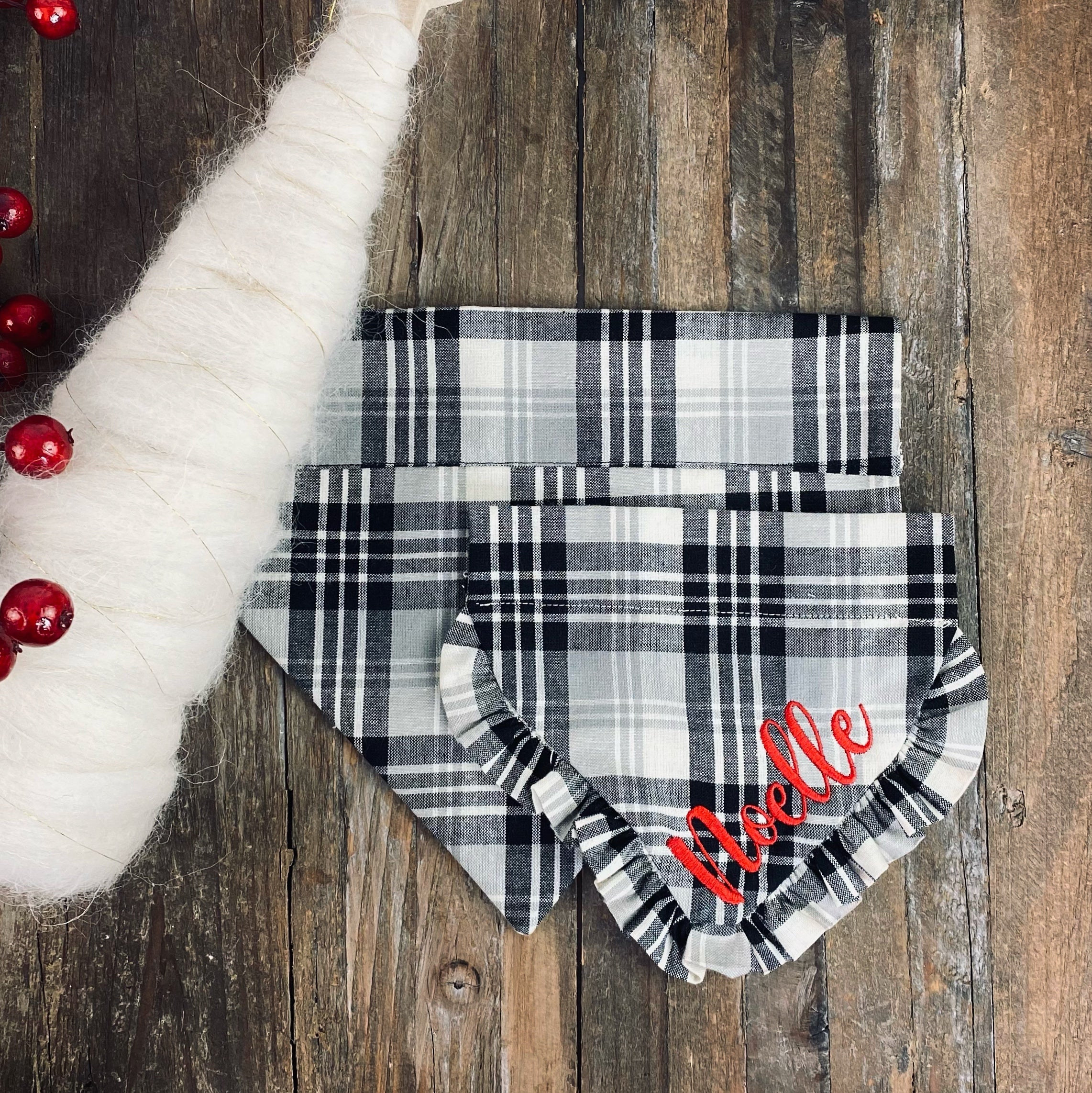 Our dog bandanas are made to slip right over your dog's collar!  Be sure to look at our size guides to help choose the correct size!