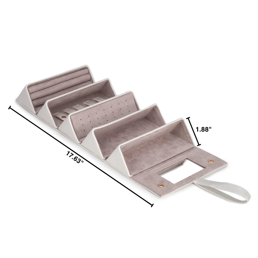But wait, there's more! It's got these five little loop snaps to keep your bracelets and necklaces tangle-free – finally! And for your rings? Three little pillow rolls to keep them snug and secure.