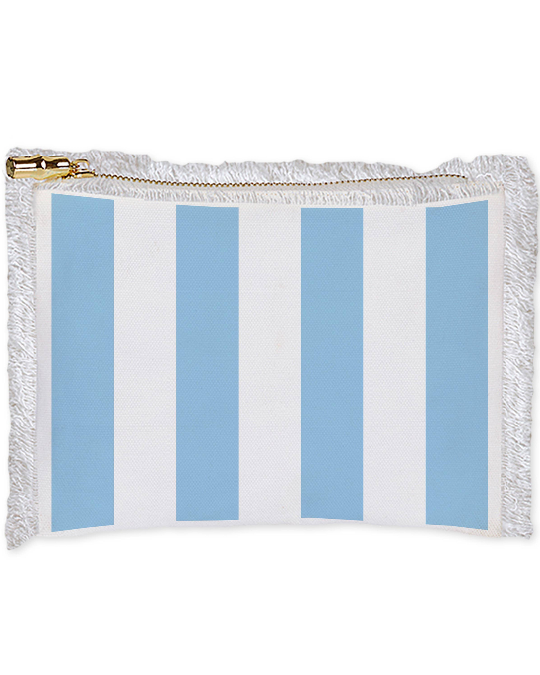 The pouch also comes with a white fringe linen trim, a gold zipper, and a bamboo zipper pull for added flair. Whether you're organizing your purse, storing cosmetics, or keeping travel essentials handy, this Cabana Stripe Linen Flat Zip Pouch is a versatile accessory that you'll love to use every day. If you are really in the mood to have a fabulous Vacay Experience, check out our Cabana Striped PJ set as well!