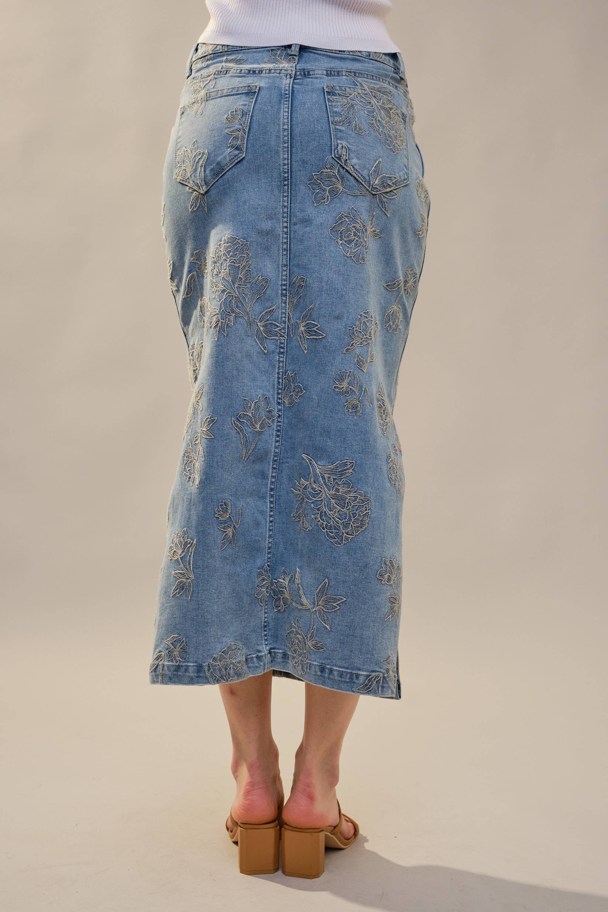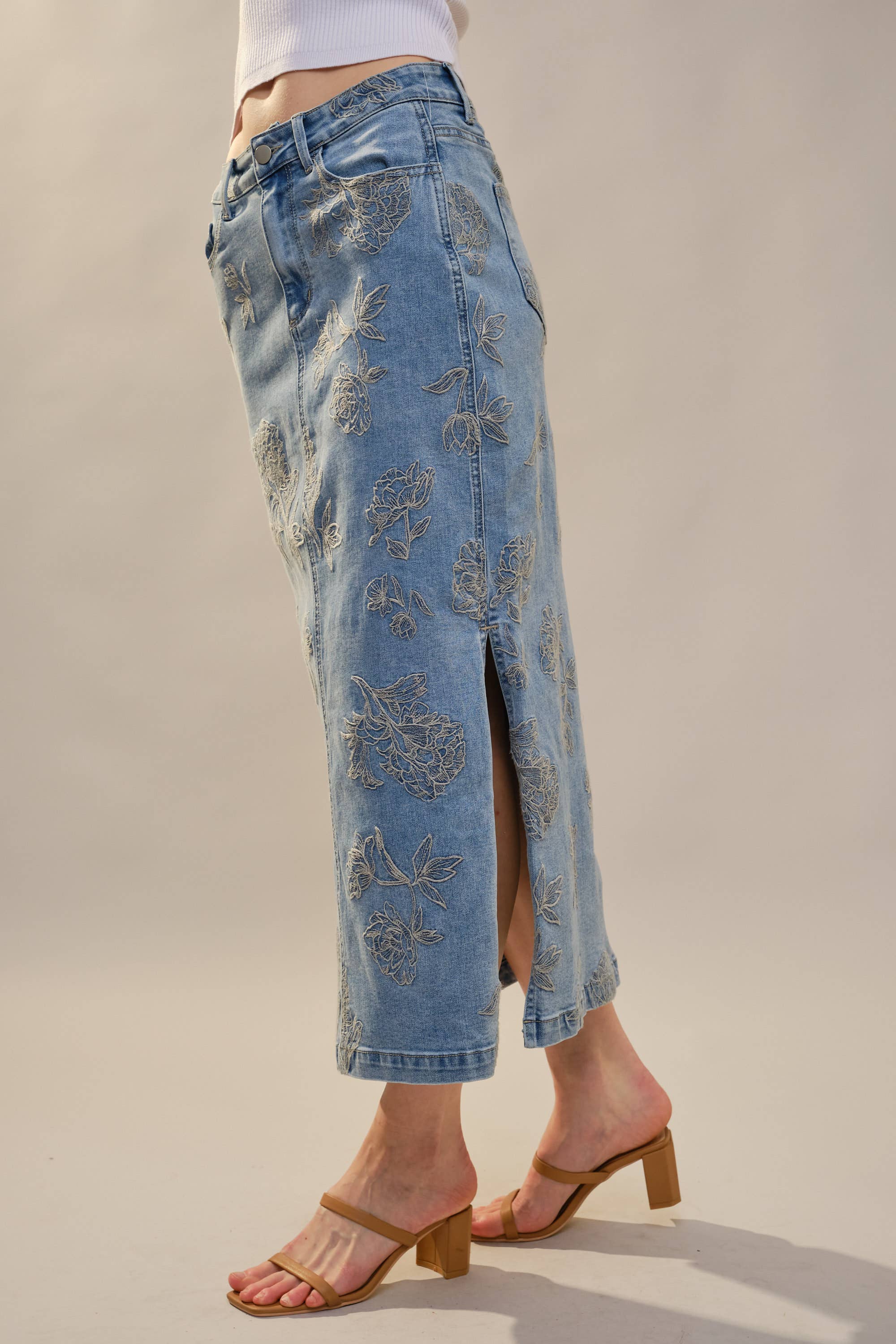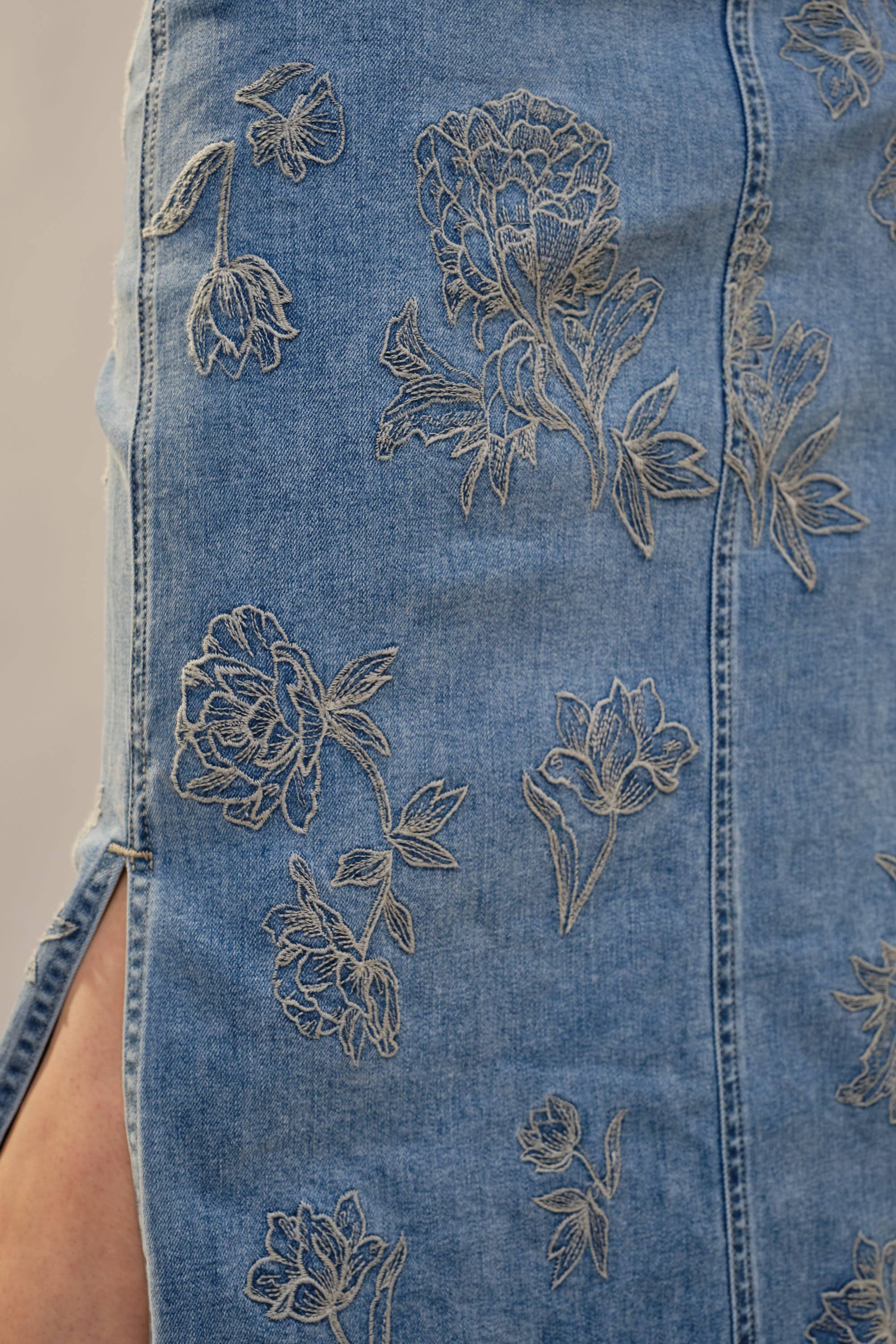 This skirt is denim, but make it feminine. The Mickey Denim Skirt features delicate tonal floral embroidery throughout, giving a classic staple a refined, elevated twist. The high rise fit is flattering and comfortable, while the front slit adds just the right amount of movement. Perfect Western Style option.