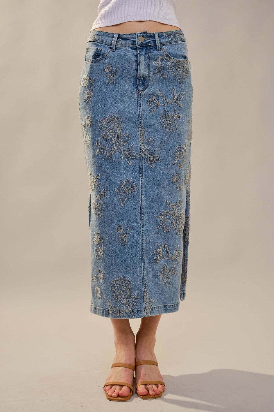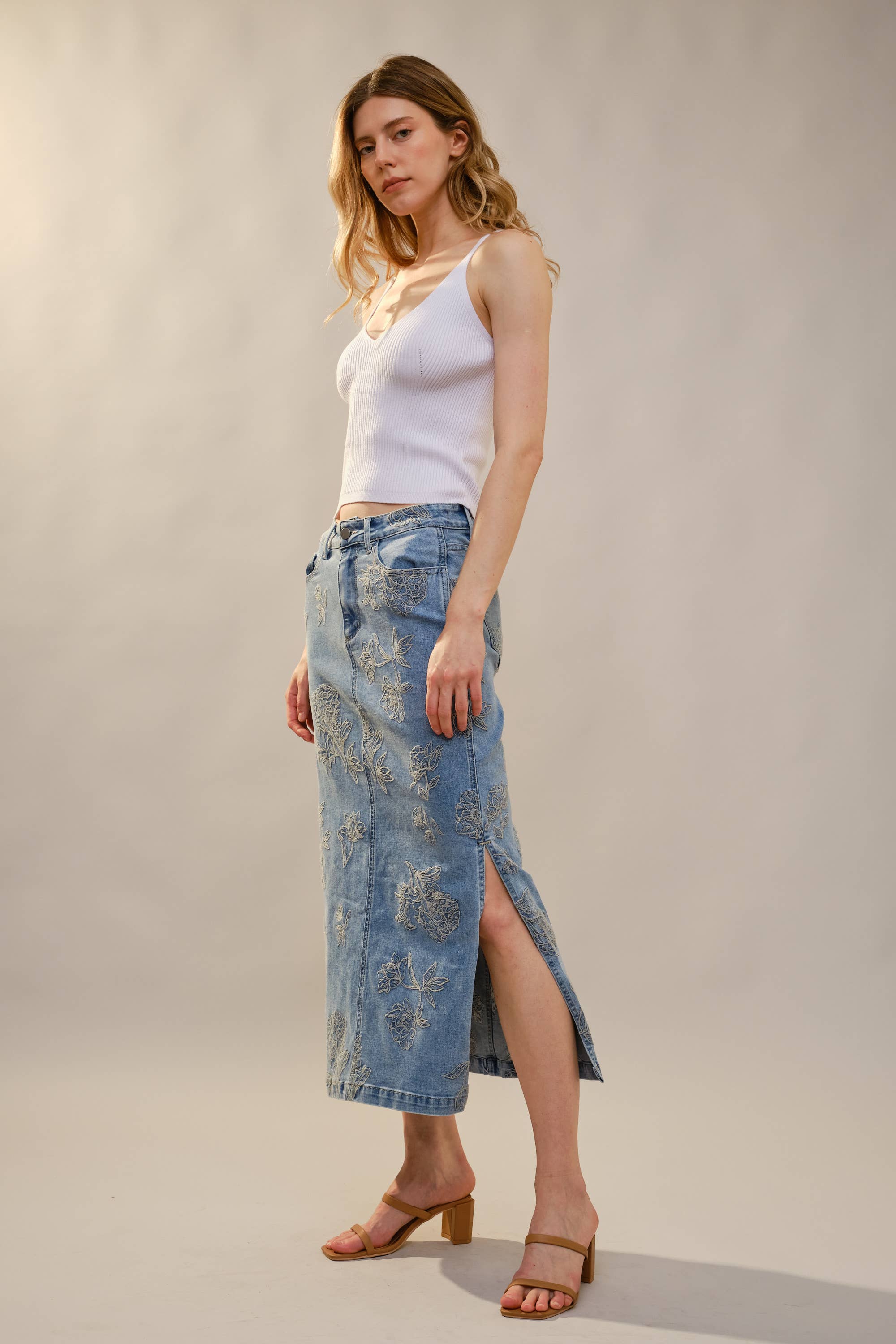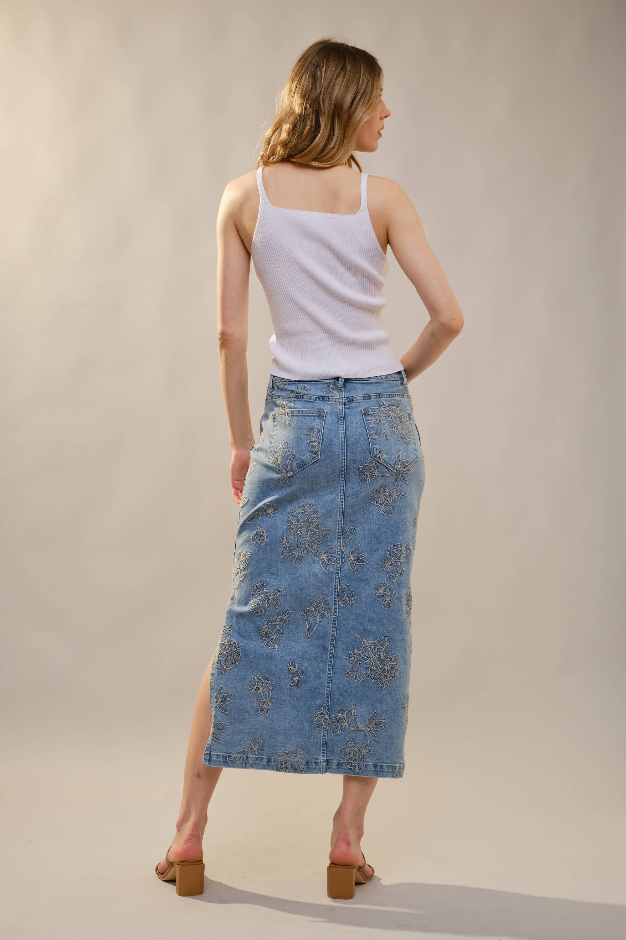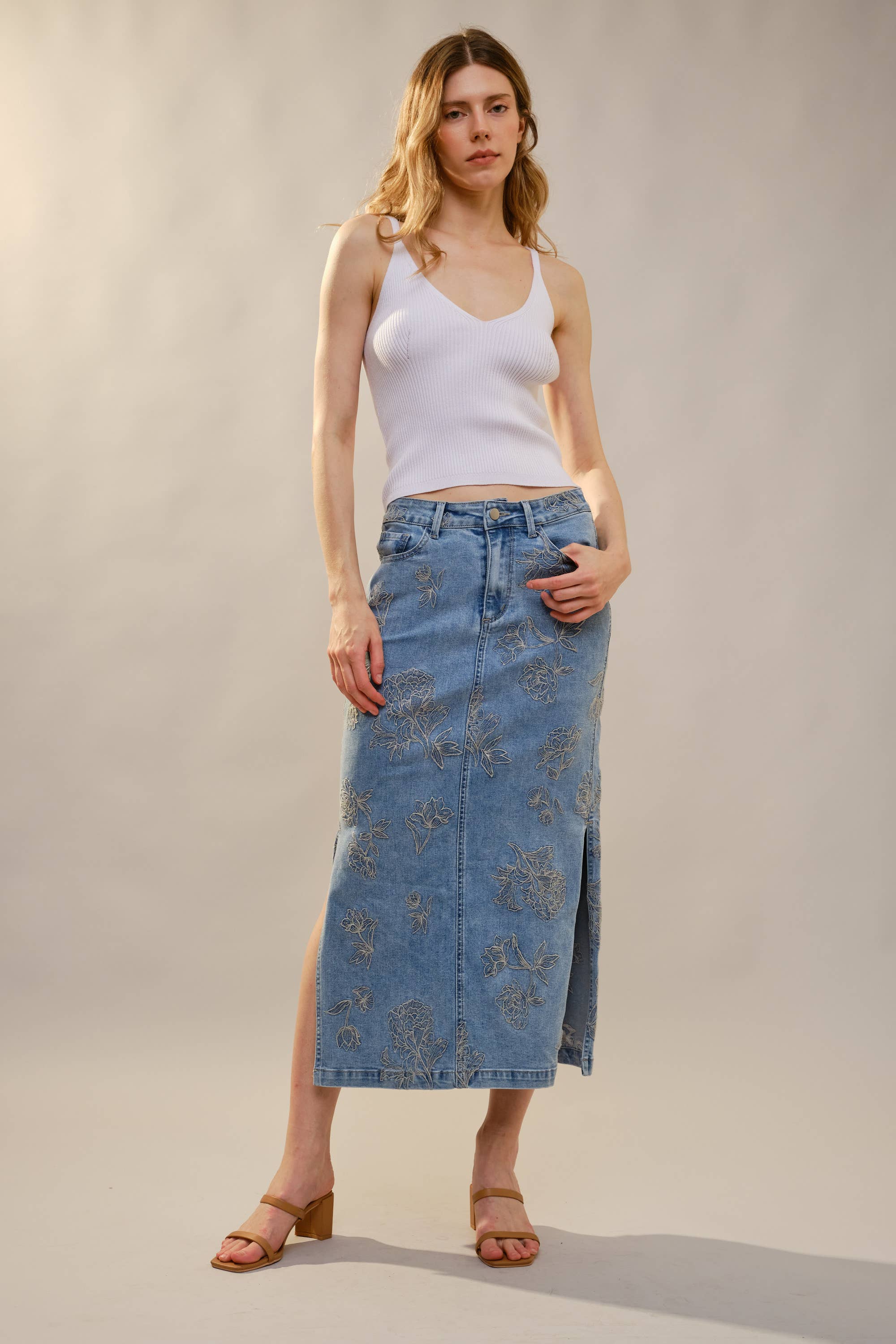 This skirt is denim, but make it feminine. The Mickey Denim Skirt features delicate tonal floral embroidery throughout, giving a classic staple a refined, elevated twist. The high rise fit is flattering and comfortable, while the front slit adds just the right amount of movement. Perfect Western Style option.