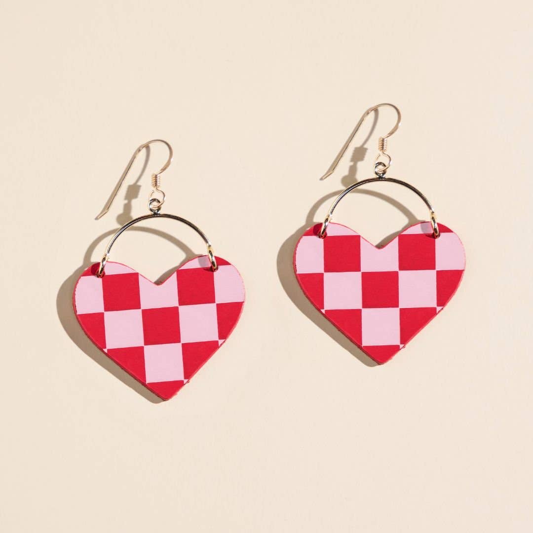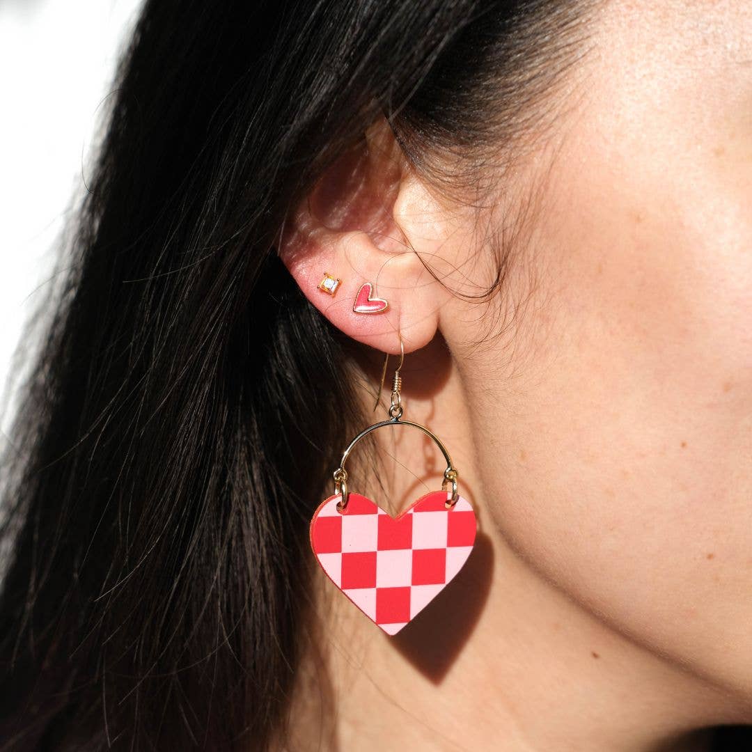 These earrings are made to be noticed. Featuring a bold, wide heart shape, the Deirdre Lover Earrings blend romantic charm with playful personality. The crimson checkered foil print layered over smooth pink leather creates a striking contrast that feels both fun and fashion-forward.