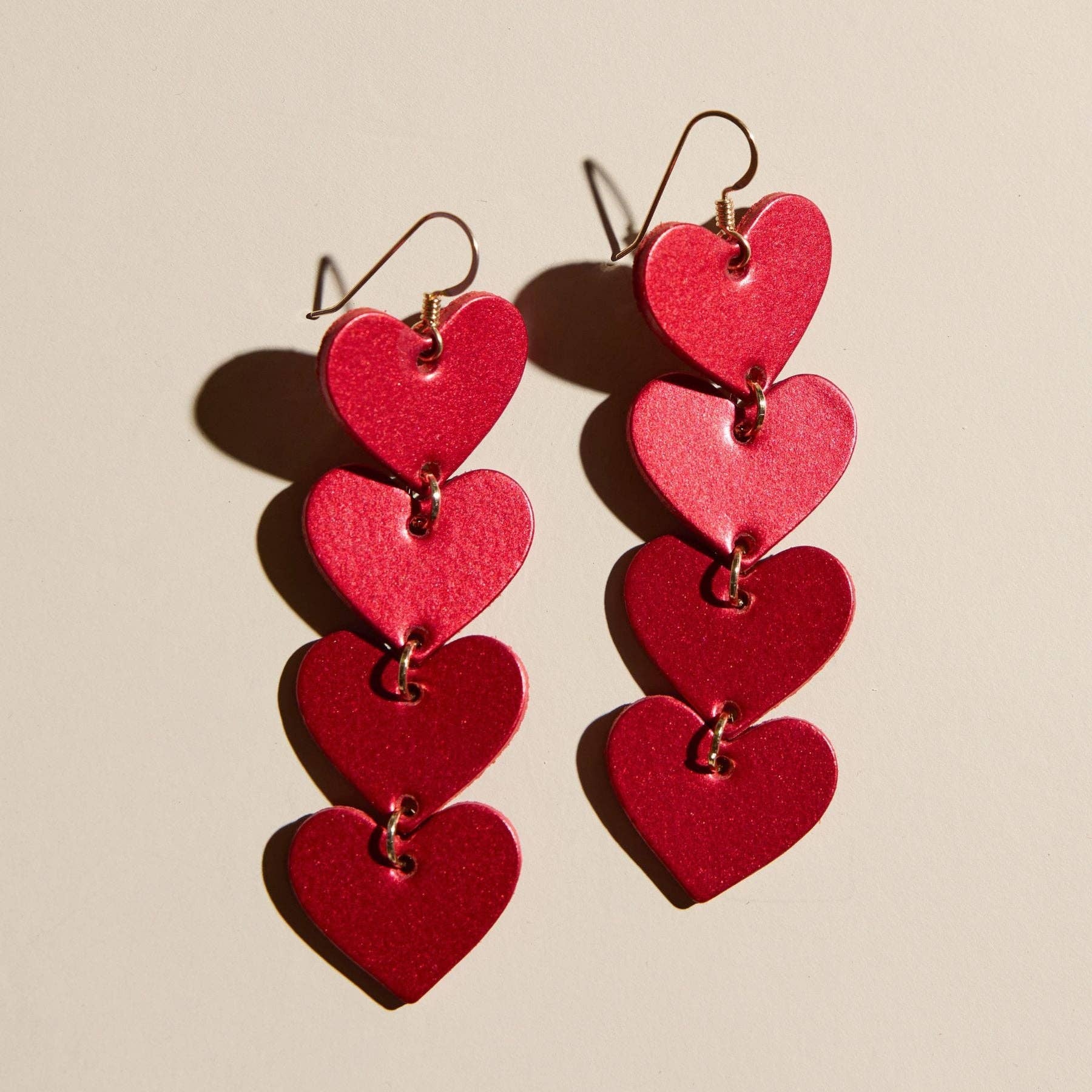 These earrings are full of movement, shine, and charm. The Ilse Hearts Drop Earrings feature a tiered heart design that creates a beautiful dangle effect, finished in premium crimson shimmer leather that catches the light just right.