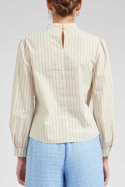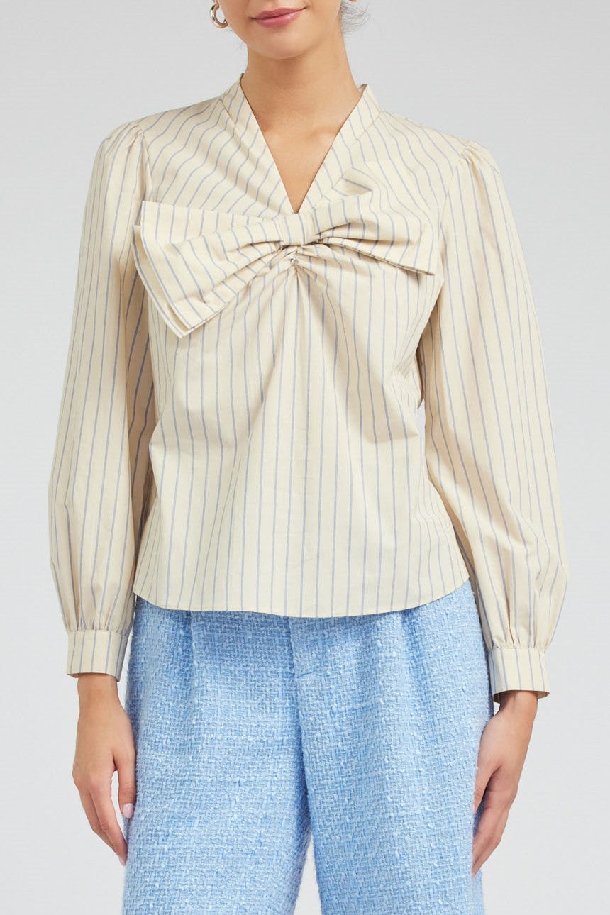 Elevate your wardrobe with the Florence Bow Detail Ladies Top. This striped long-sleeve blouse combines timeless patterns with delicate bow accents, creating a sophisticated and feminine piece.