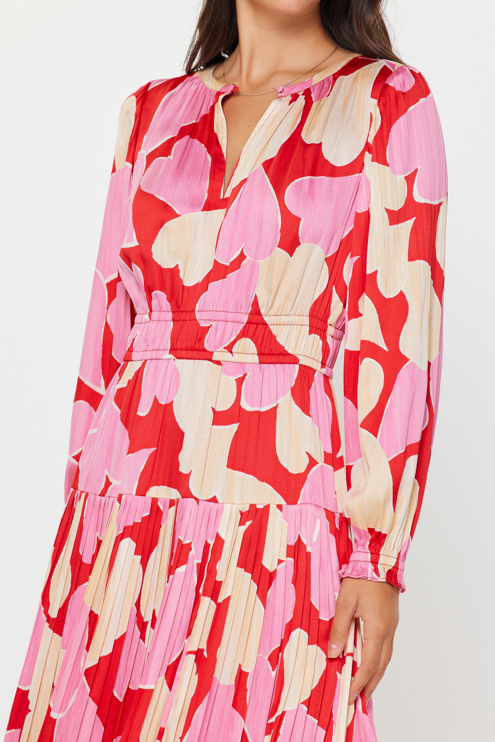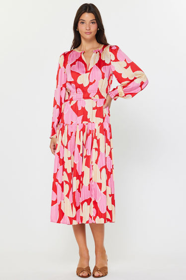 The split keyhole neckline adds a soft, feminine touch, while the smocked waist creates a flattering shape without sacrificing comfort. Finished with long sleeves, ruffled cuffs, and a pleated midi skirt, it moves beautifully and feels just as good as it looks.