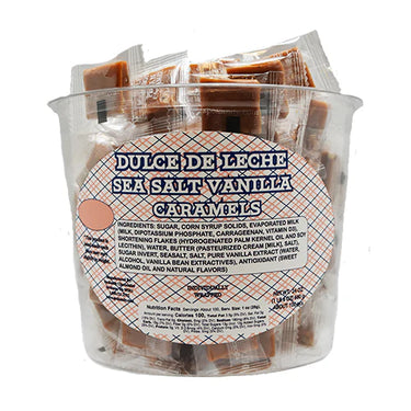 Indulge in the irresistible combination of sweet and salty with our Dulce De Leche Caramel: Sea Salt Vanilla Individual Bites. These caramels are crafted using a time-honored family recipe, resulting in a unique and delectable treat.