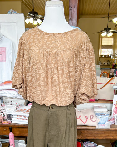 Featuring short bubble sleeves, slightly dropped shoulders, and a rounded neckline, this top offers a playful and feminine silhouette. The back button closure adds a touch of classic elegance, while the ruched detailing on the chest and sleeves creates a textured look. The relaxed and loose fit allows for comfortable movement, and the floral lace detailing adds a touch of sophistication.
