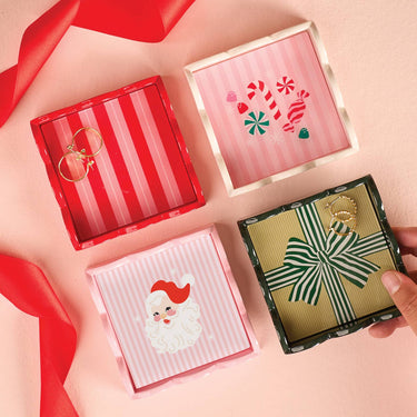 Keep your favorite accessories beautifully organized with our Holiday Scalloped Trinket Trays. Featuring a charming scalloped rim and festive, hand-illustrated designs, these glossy trays are as functional as they are decorative. Perfect for holding jewelry, keys, or small keepsakes, they bring a touch of holiday cheer to your vanity, dresser, or nightstand.