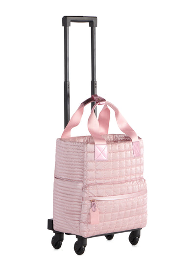 The Logan 360º Roller Tote is designed for the woman who doesn’t want to sacrifice style for function. Crafted from quilted metallic nylon, it’s both eye-catching and incredibly practical. Smooth 360° spinner wheels and an extending roller handle make navigating airports, sidewalks, and hotel lobbies feel effortless—while the sleek silhouette turns every head along the way.