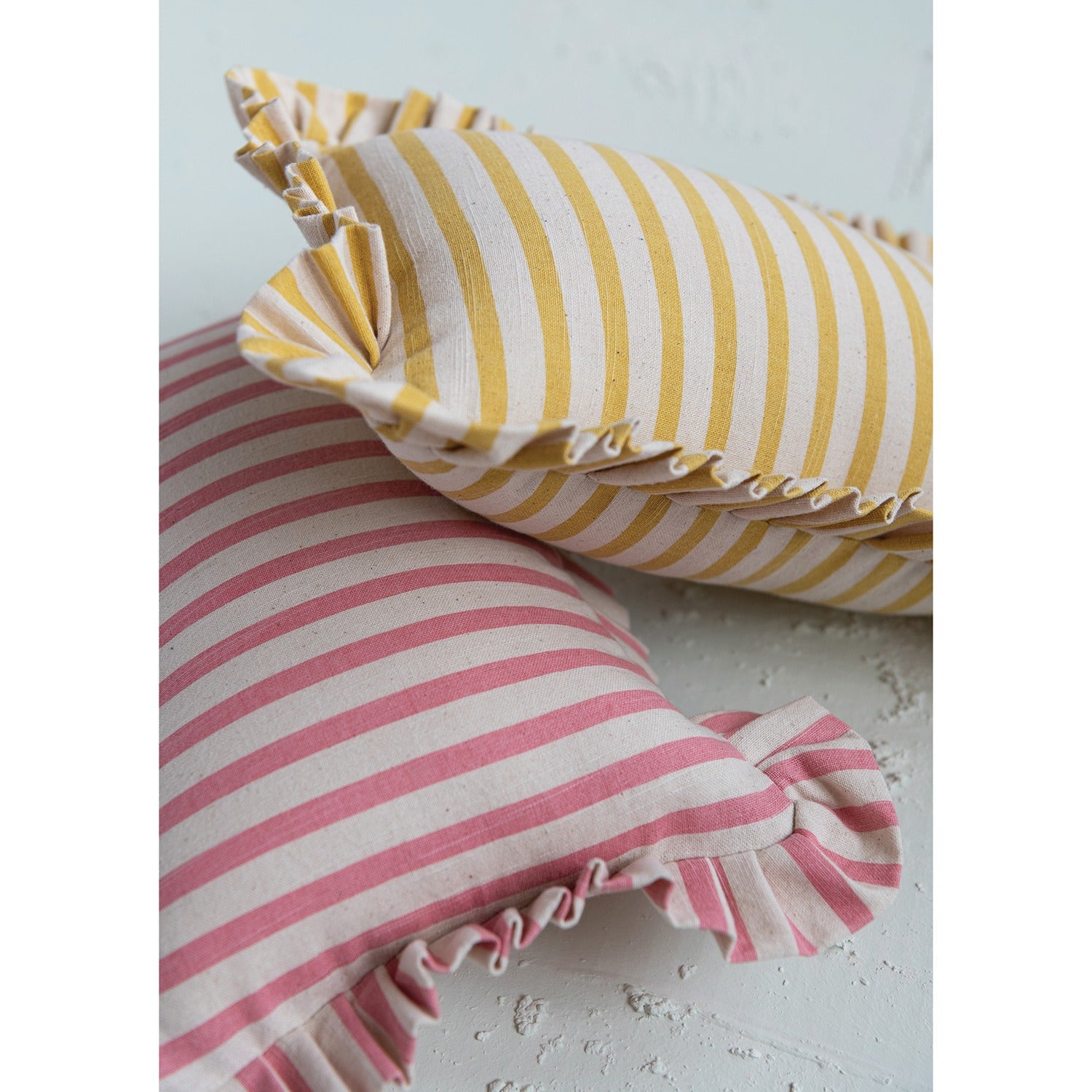 - Stylish Striped Design: Featuring a classic striped pattern, these pillows add a touch of timeless style to any room. [Based on the image, you can specify the colors: "Available in cheerful pink and off-white stripes and sunny yellow and off-white stripes."]
