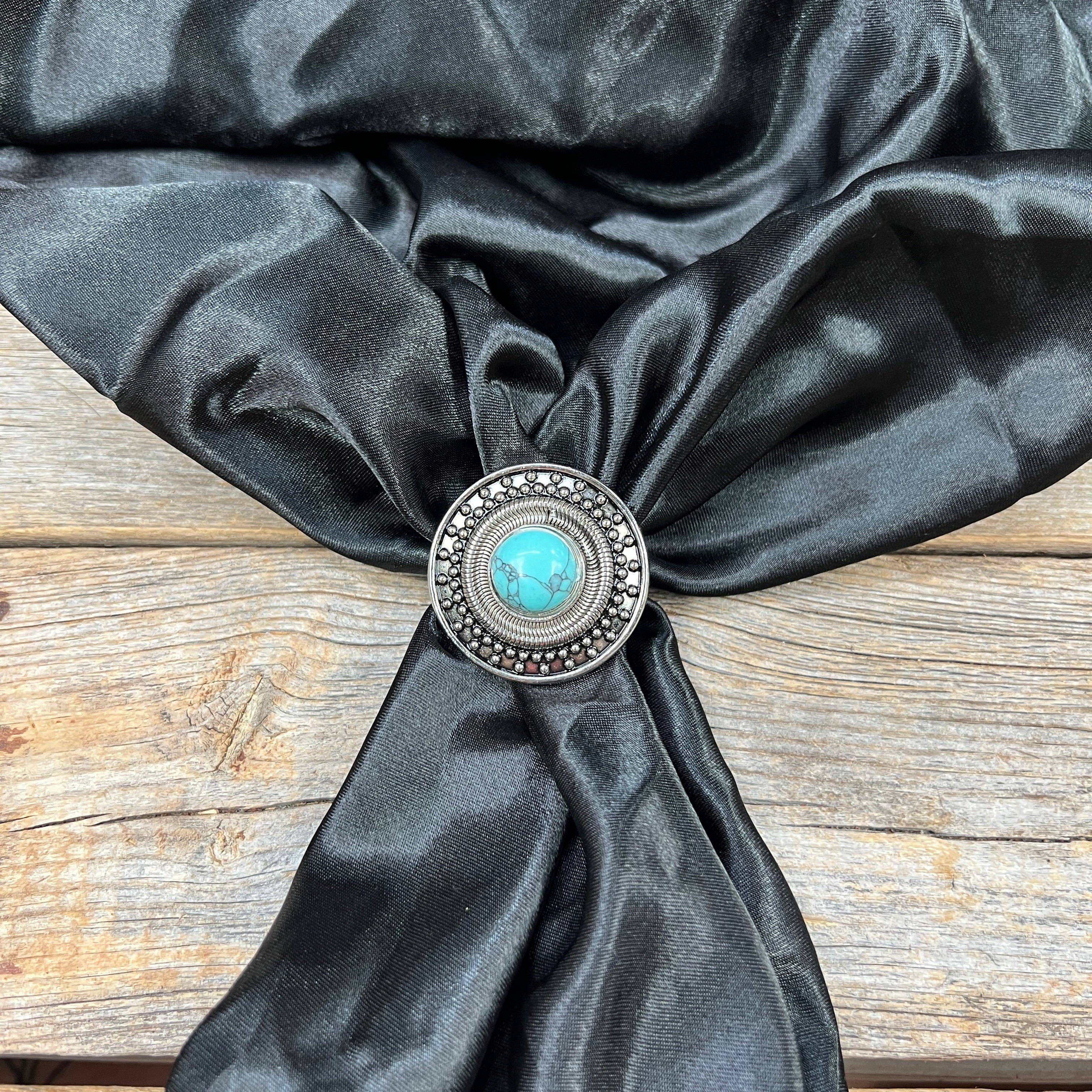 This classic western concho slide features an antique silver finish with a timeless dot design, accented by a turquoise-colored center stone. Simple yet eye-catching, it’s a versatile piece that pairs beautifully with any wild rag in your collection.